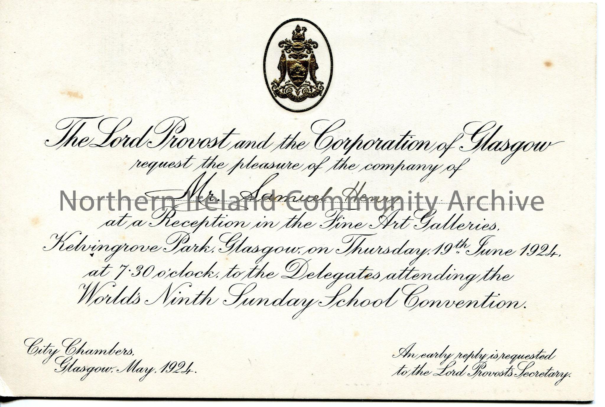 Invitation to Sam Henry from the Lord Provost and Corporation of Glasgow to attend reception for World’s 9th Sunday School Convention.