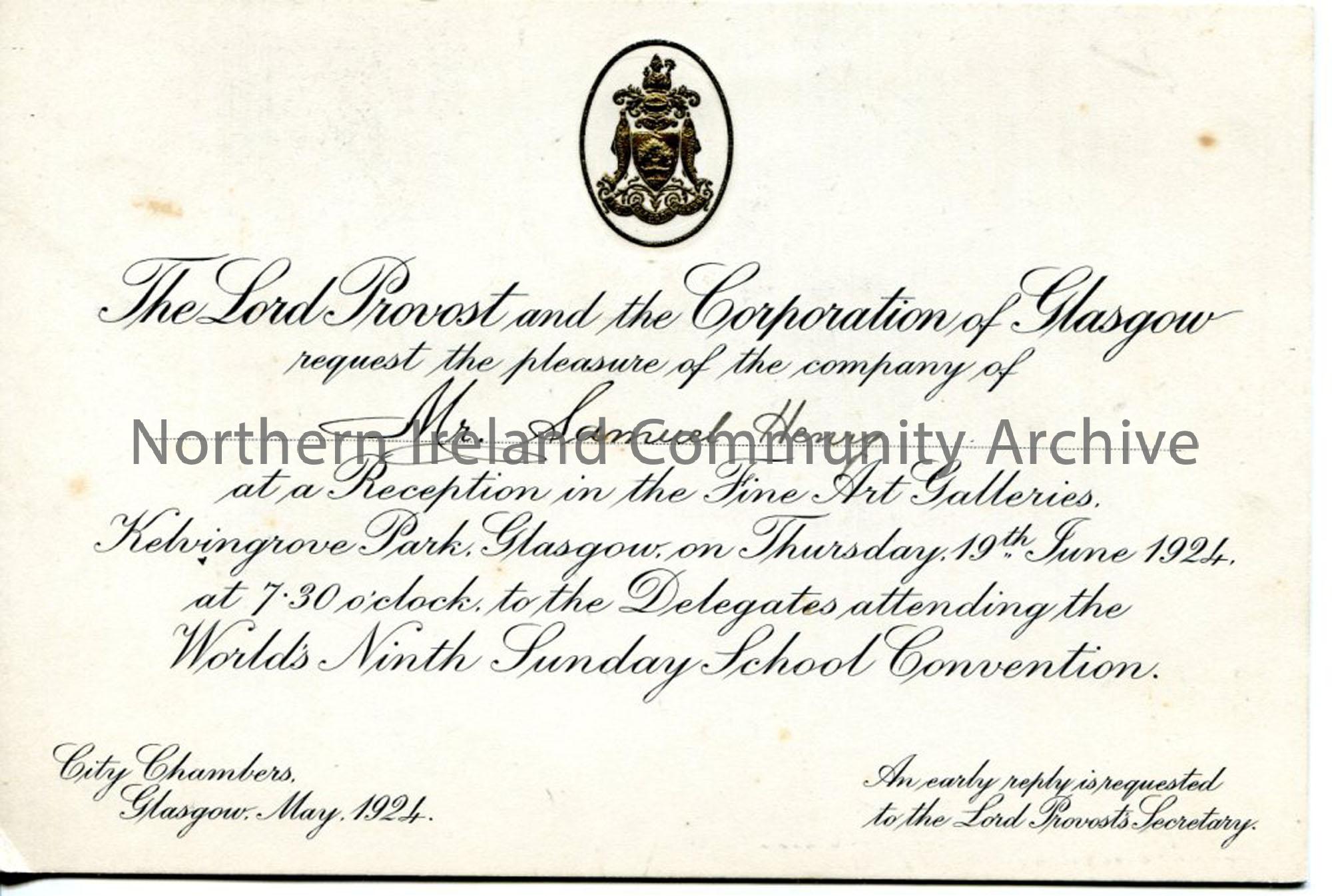 Invitation to Sam Henry from the Lord Provost and Corporation of Glasgow to attend reception for World's 9th Sunday School Convention.