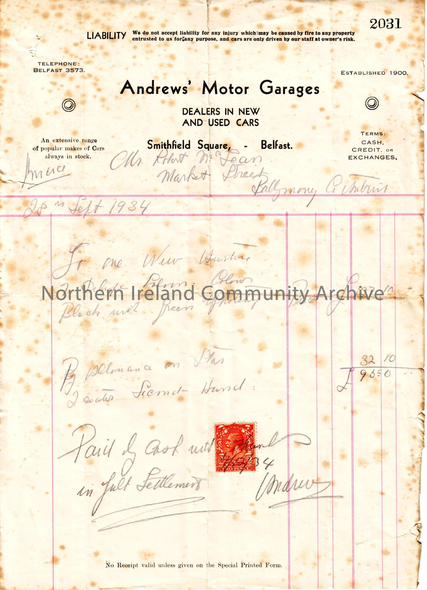 Invoice for car bought by Donor’s father. A New Austin 7 Deluxe Saloon, black with green upholstery from Andrews’ Motor Garages, 28th September 1934
