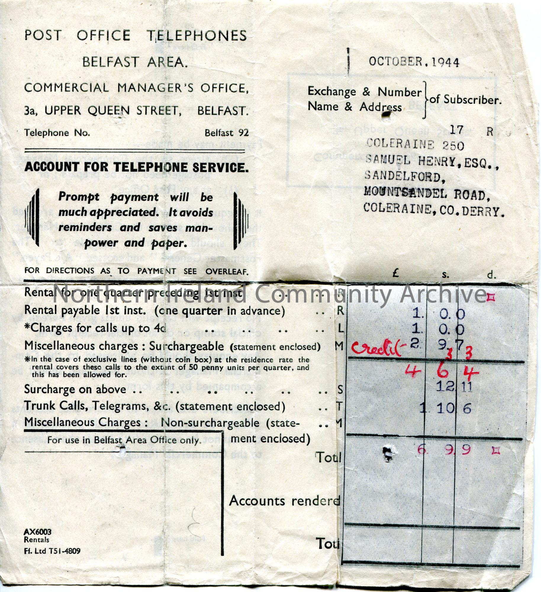 Invoice for charges to Sam Henry’s account for telephone service. For a total of £6.9.9.