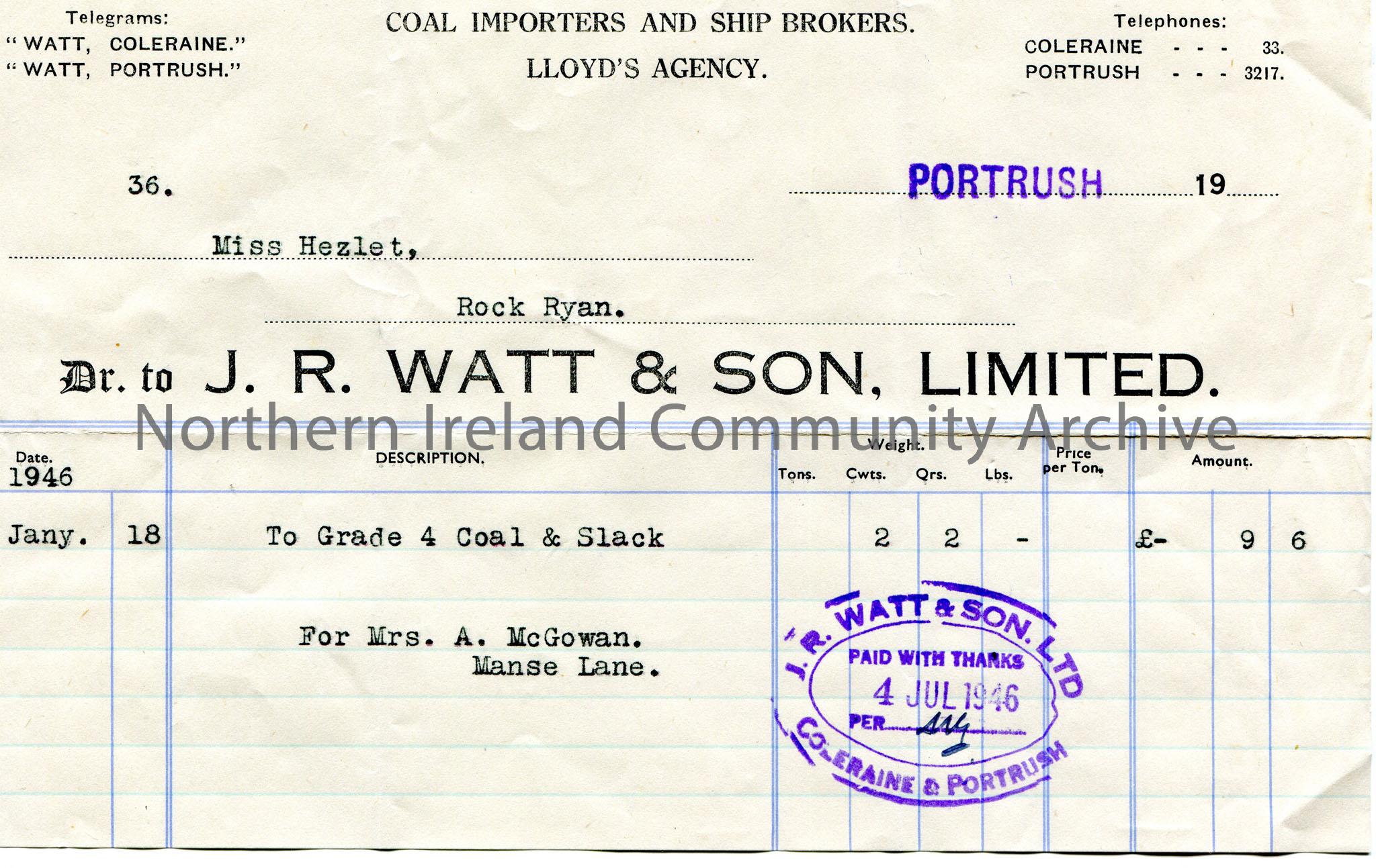 Invoice for Miss Hezlet, Rock Ryan from J.R.Watt & Son, Limited, Portrush, Coal Importers and Ship Brokers. Dated for 18th January, 1946 for grade 4 coal and slack for Mrs A. McGowan, Manse Lane. Paid with thanks stamp dated 4th July, 1946.