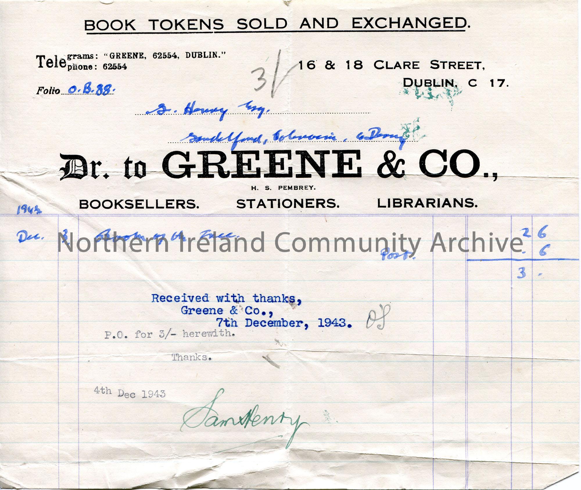 Invoice for Sam Henry from Green & Co bookshop for the price of a book and postage. Totalling £0.3.0. Dated 3rd December 1943. Sam's signature on bottom of receipt.