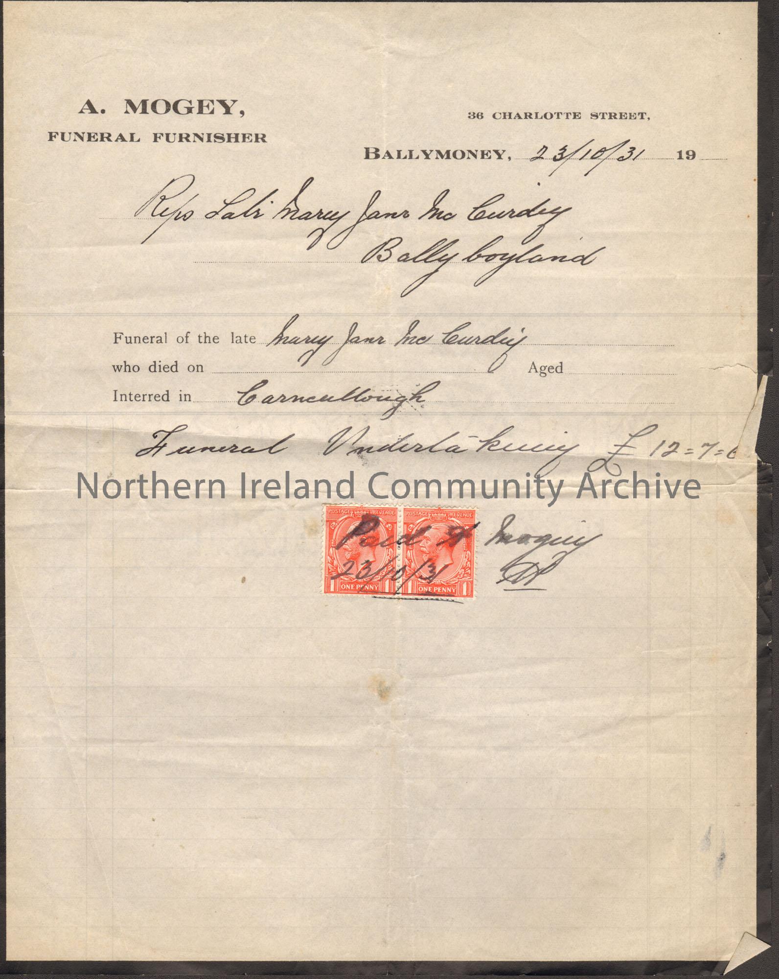 Invoice from A. Mogey, Funeral Furnisher on white paper with a black frame.