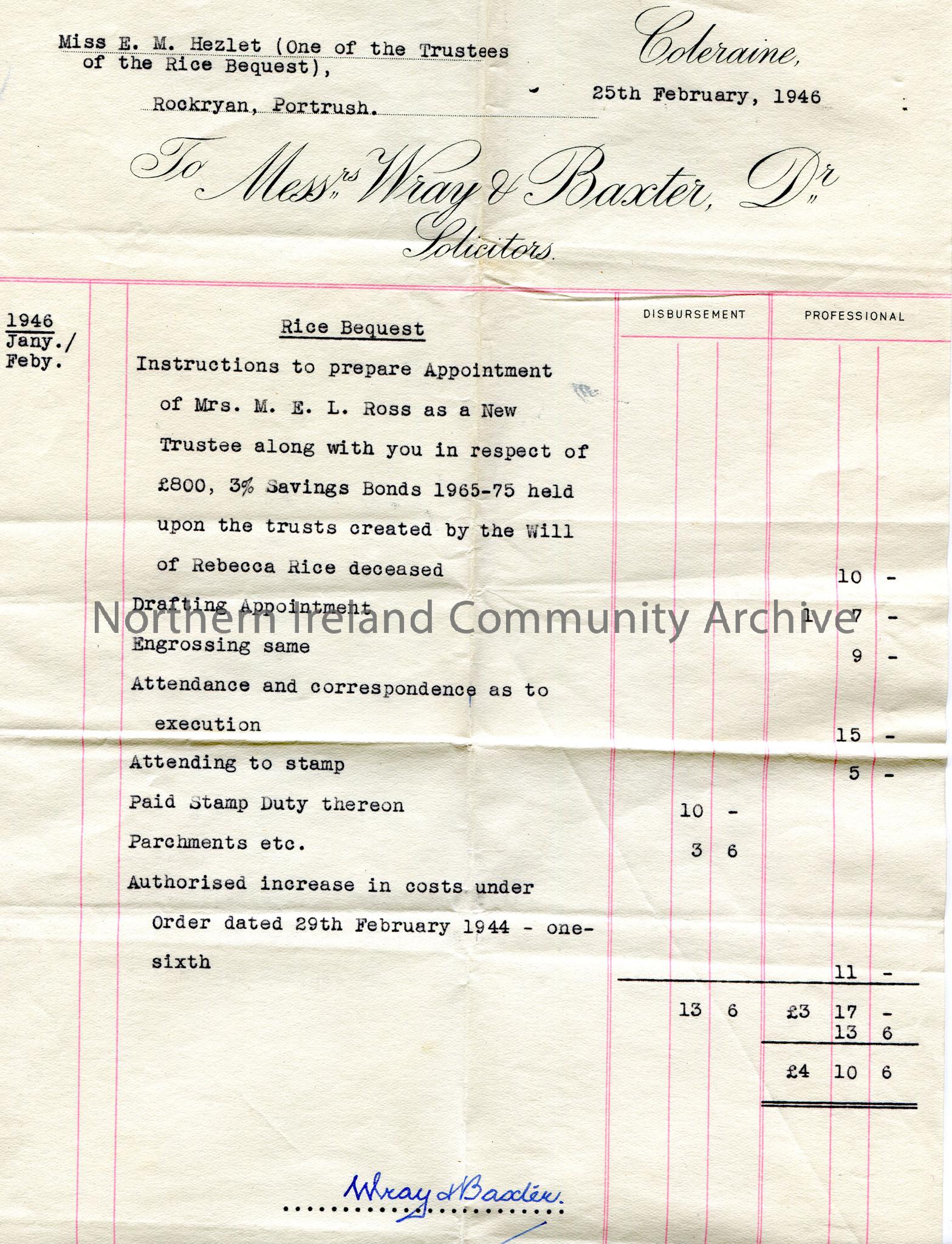 Invoice re Rice Bequest from Miss E. M. Hezlet. Dated 25th February, 1946 to Wray and Baxter Solicitors. ‘Cheque enclosed. Please send receipt’ handwr…