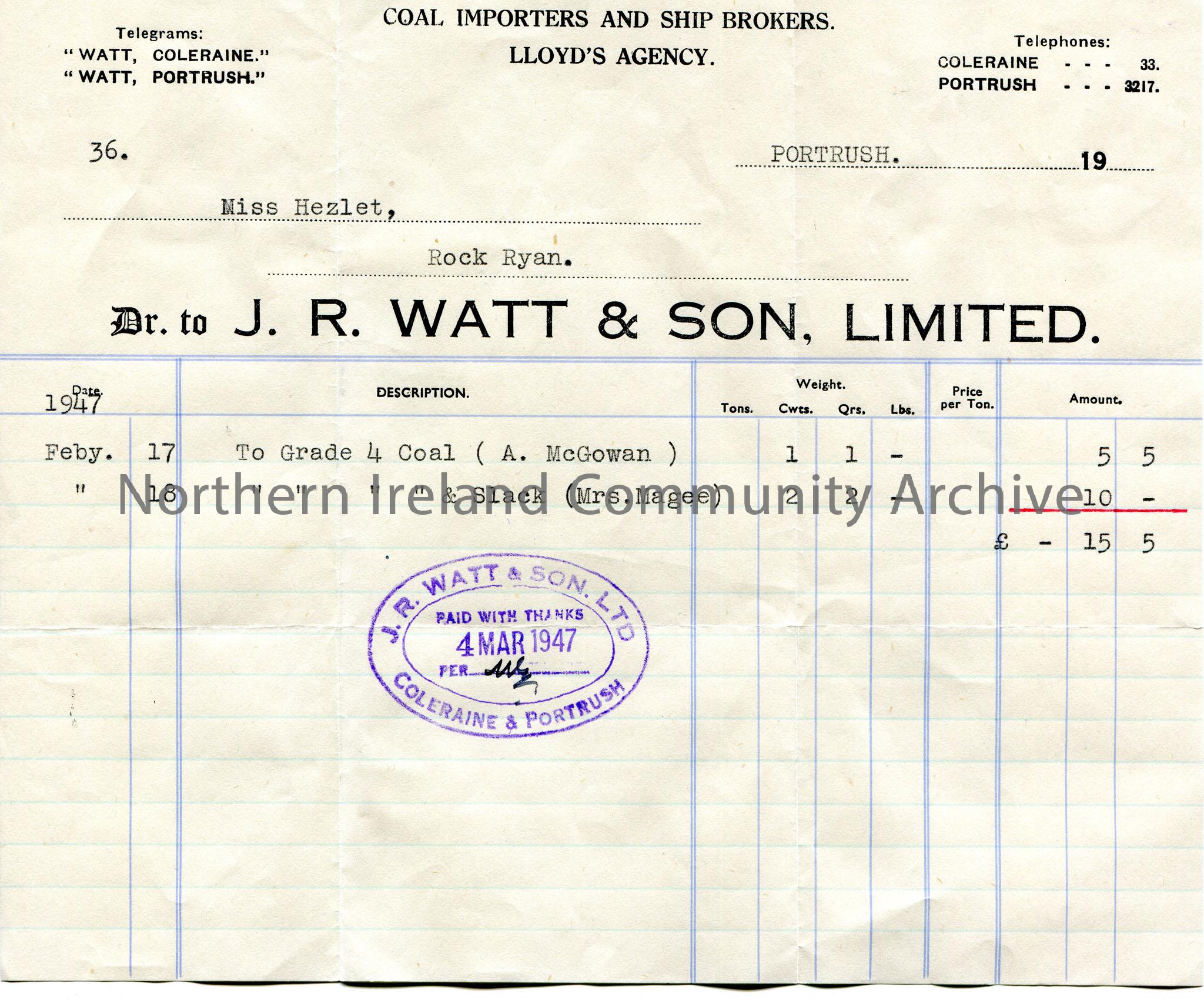 Invoice to Miss Hezlet, Rock Ryan from J.R.Watt & Son, Limited for £-15-5 for grade 4 coal and slack for A.McGowan and Mrs Magee on 17th and 18th February 1947. Paid with Thanks stamp dated 4th March, 1947.