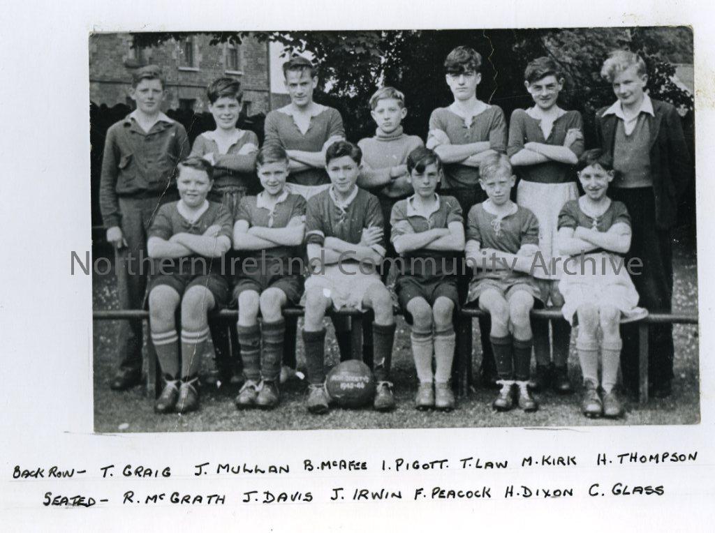 Irish Society School Team, Coleraine, 1947: Back Row- T. Craig, J. Mullan, B. McAfee, I. Pigott, T. Law, M. Kirk, H. Thompson. Seated- R. McGrath, J. Davis, J. Irwin, F. Peacock, H. Dixon, C. Glass