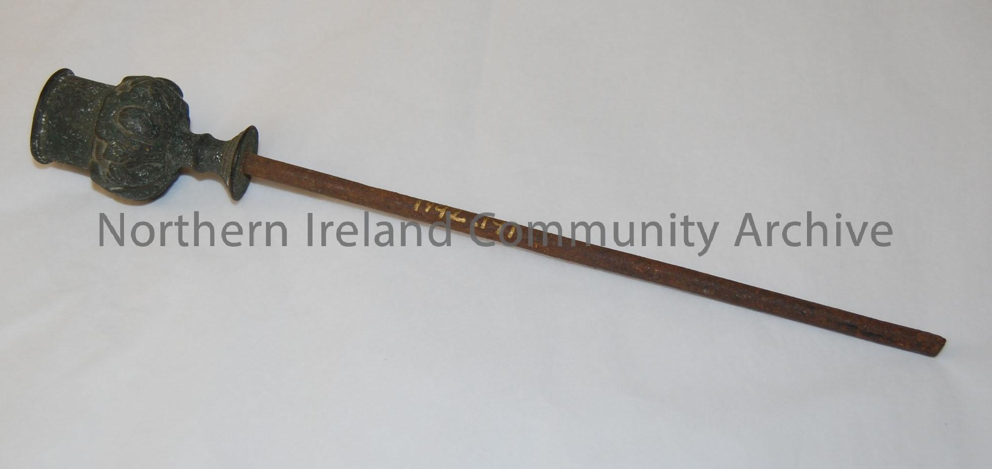 Iron rod with decorative socket for candle and there are signs of a break at end of rod.