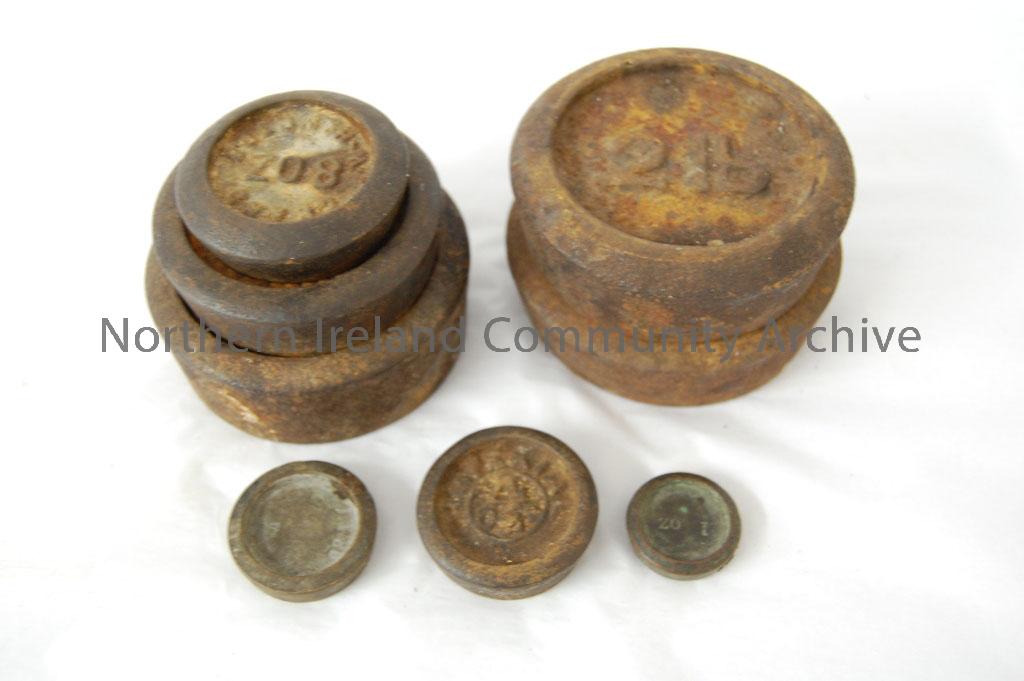 Iron Weights, 1 X 4lb, 3 X 2lb, 1lb, 8oz, 4oz, 2oz, 1oz. For Scales see BHC: 1997.5 – 1998.18