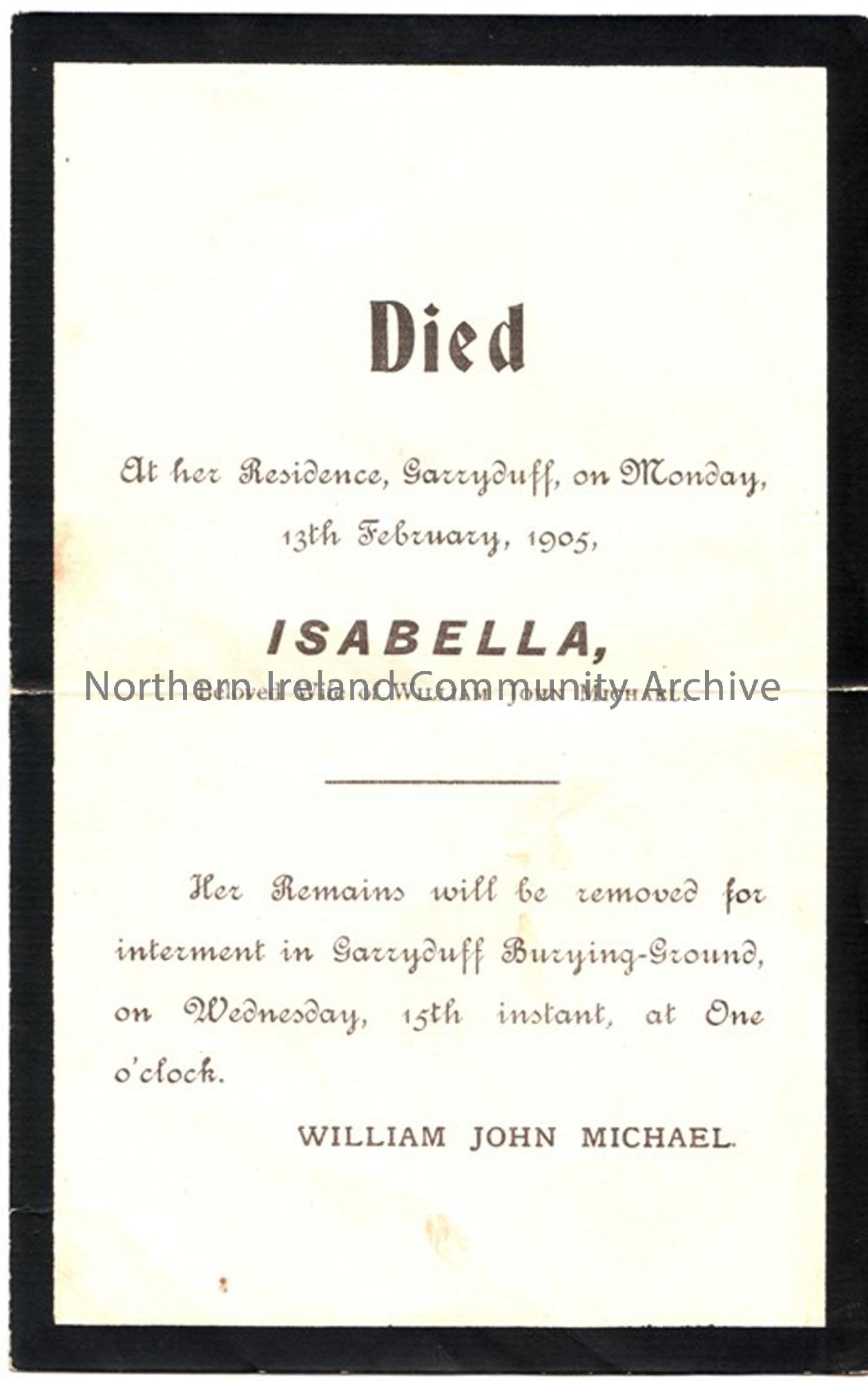 Isabella Michael of Garryduff, buried in Garryduff Burying Ground d. 13th February 1905
