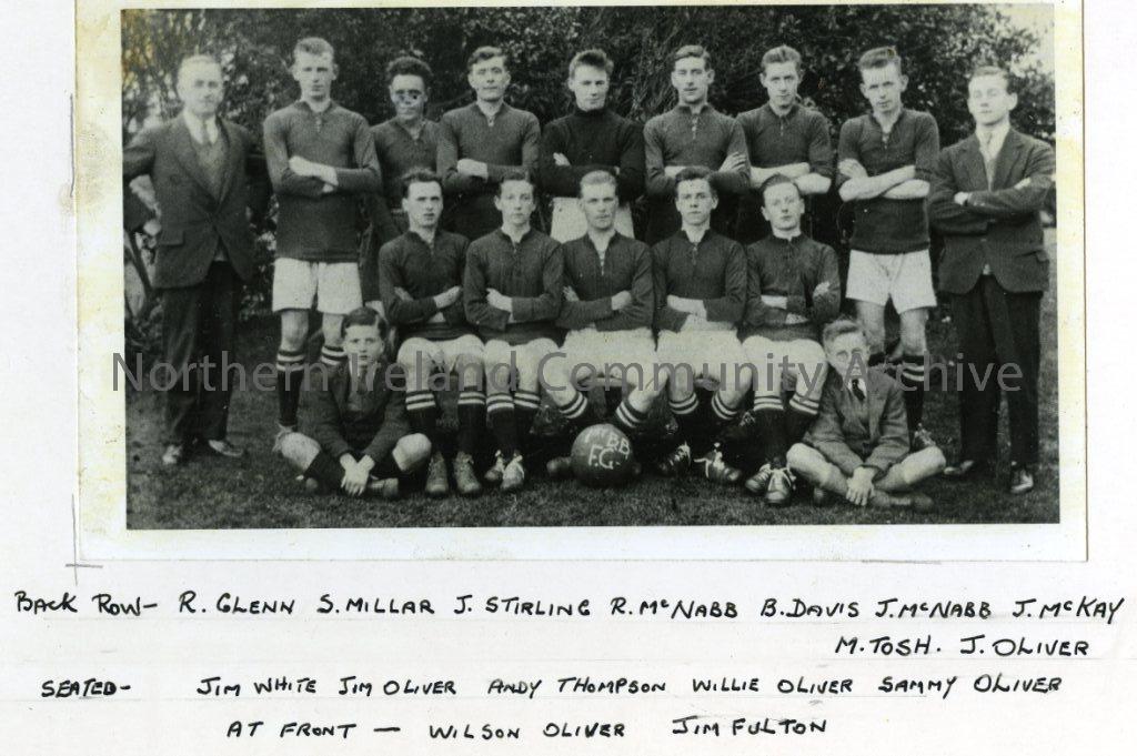 Ist Coleraine Boys Brigade Football Team, 1926: Back Row- R. Glenn, S. Millar, J. Stirling, R. McNabb, B. Davis, J. McNabb, J. McKay, M. Tosh, J. Oliver. Seated- Jim White, Jim Oliver, Andy Thompson, Willie Oliver, Sammy Oliver. At Front- Wilson Jim Ful (1477)