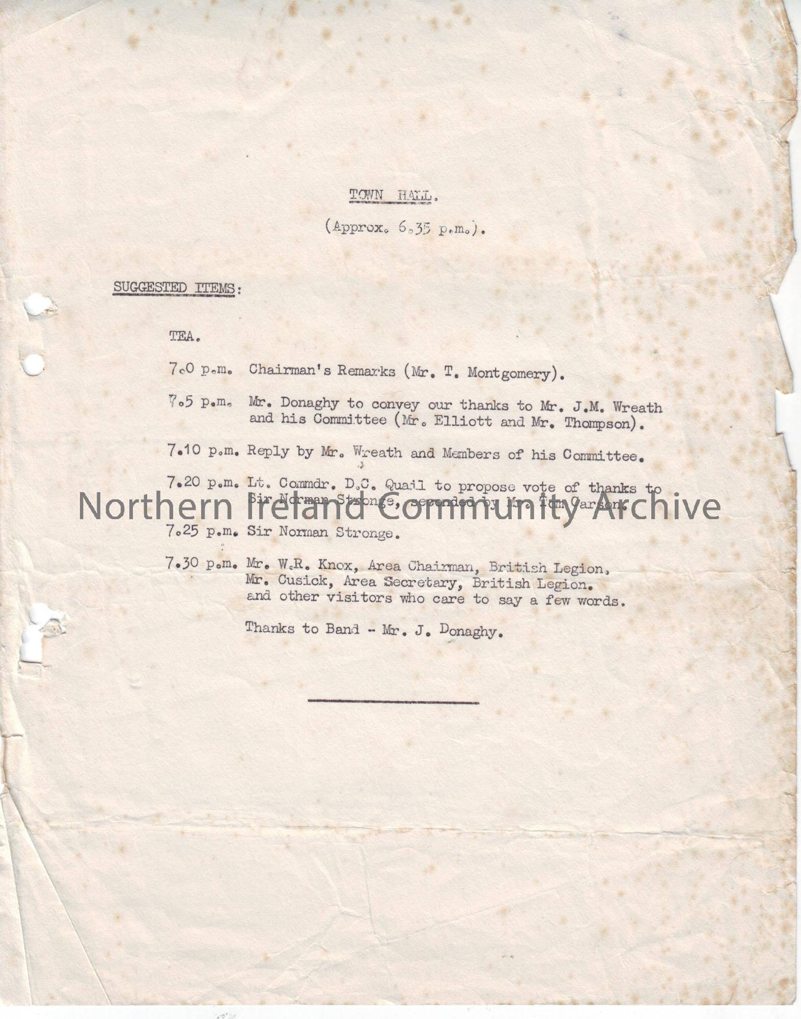 itinerary for a meeting of the British Legion at Ballymoney Town Hall