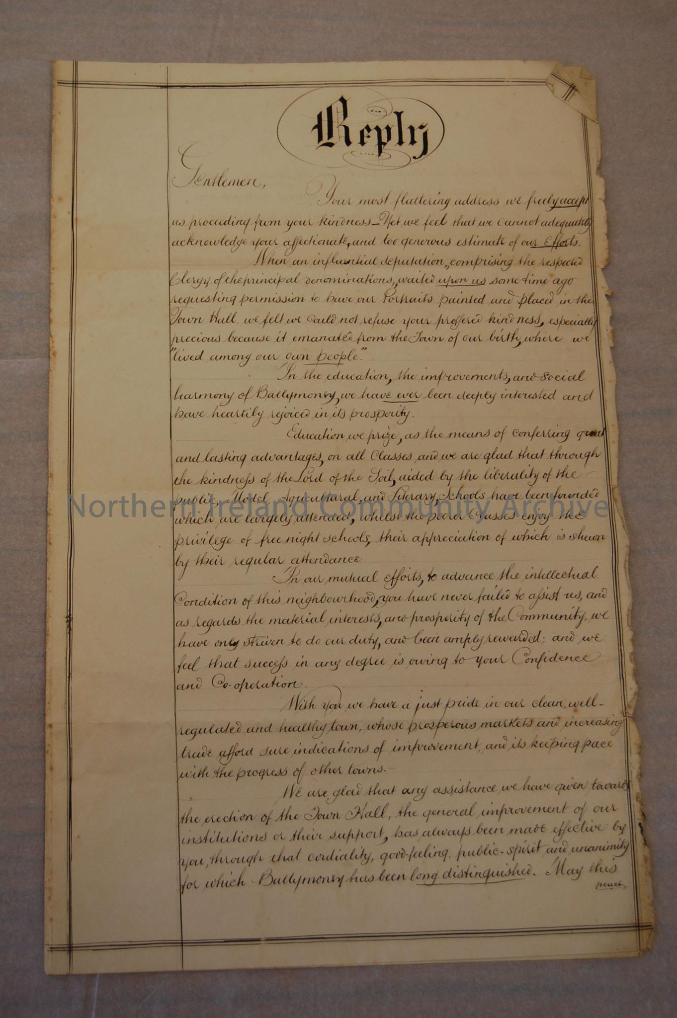 James Cramsie and Dr William Taylor's reply to the address of the Town Commissioners regarding Town Hall portraits