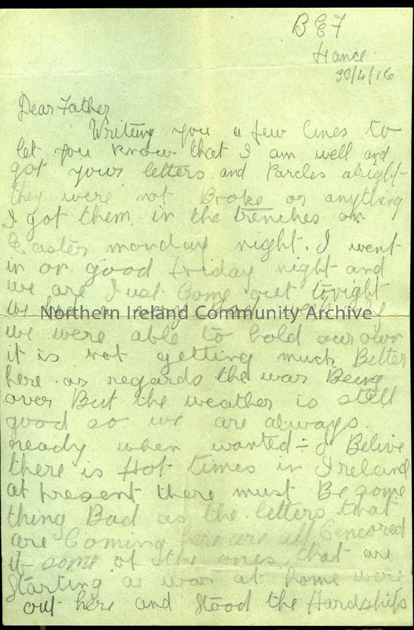 In the letter, Private Henry mentions conditions on the Front and the limited news they have received about the Easter Rising. "I believe there is hot times in Ireland at present there must be something bad as the letters that are coming here are all censored..."