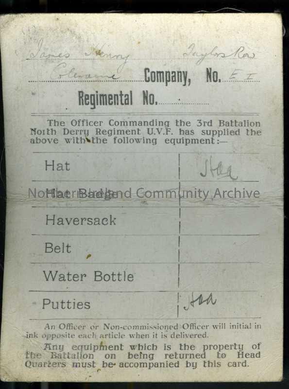 James Henry's equipment card for 3rd battalion North Derry Regiment of the UVF - notes James has been supplied with hat and putties as uniform
