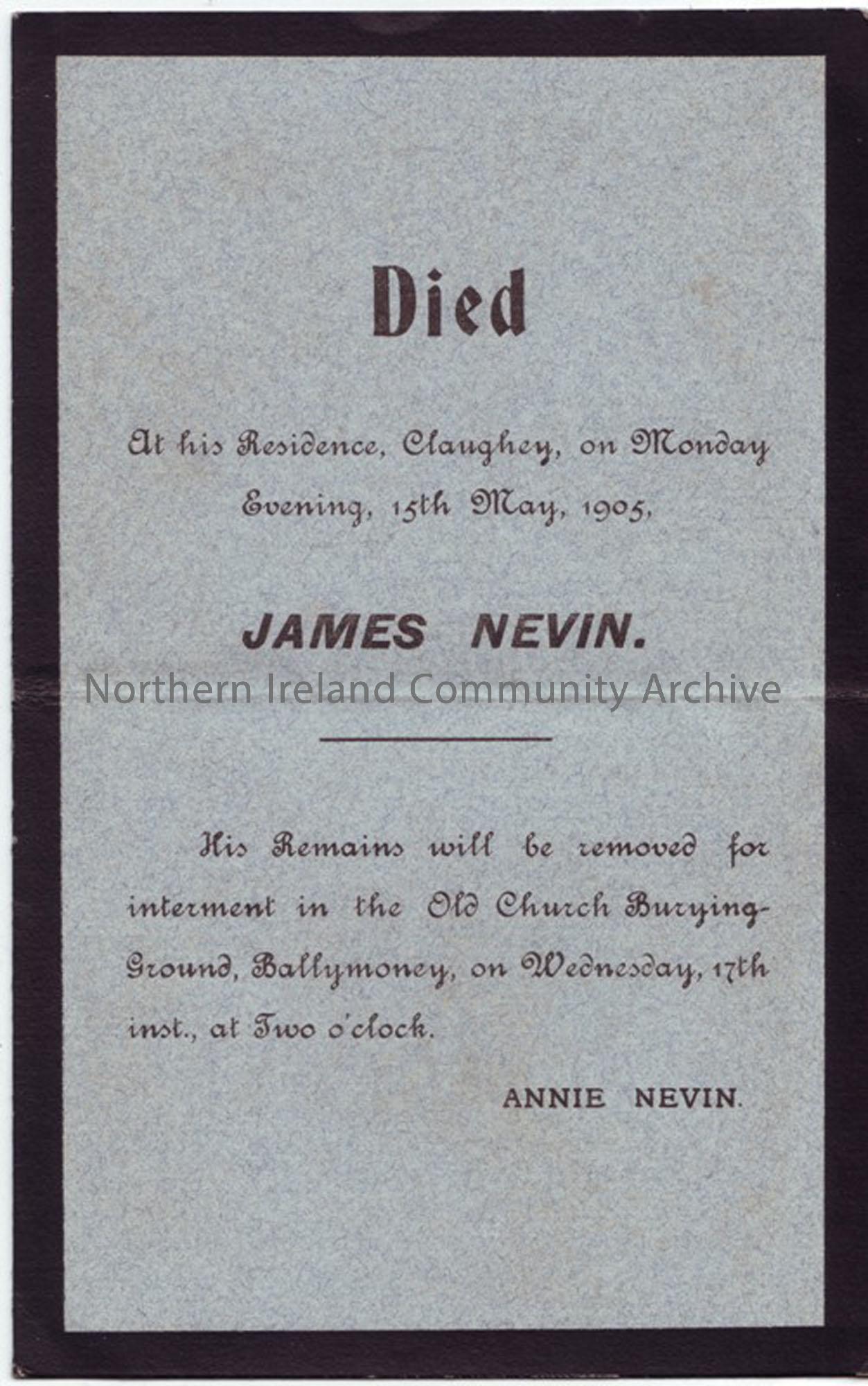James Nevin of Claughey, buried in Old Church Burying ground, Ballymoney d. 24th May 1907