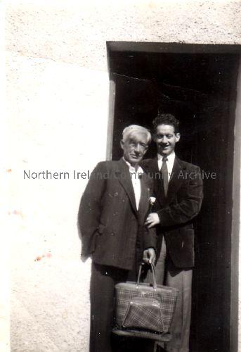 Jamsie Johnston with his grandson Jim Johnston on Dervock Main Street. Jamsie lost his right arm in the First World War and Jim lost his right arm in the rollers of the New Mill, Knowehead Street.