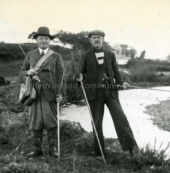 2 men [Jock Smylie and Tom Bellas], 1 in plus fours, beside river with fishing rods and net. (JM - Tom Bellas was owner of Bellas Timber Yard and Builders Providers, Coleraine - he spent more time fishing and it is said he was eventually swindled out of business by a senior employee. This is at the reach of the Clough River known as Leggyfat. Jock Smylie lived at Leggyfat, Limavallaghan, Clough)