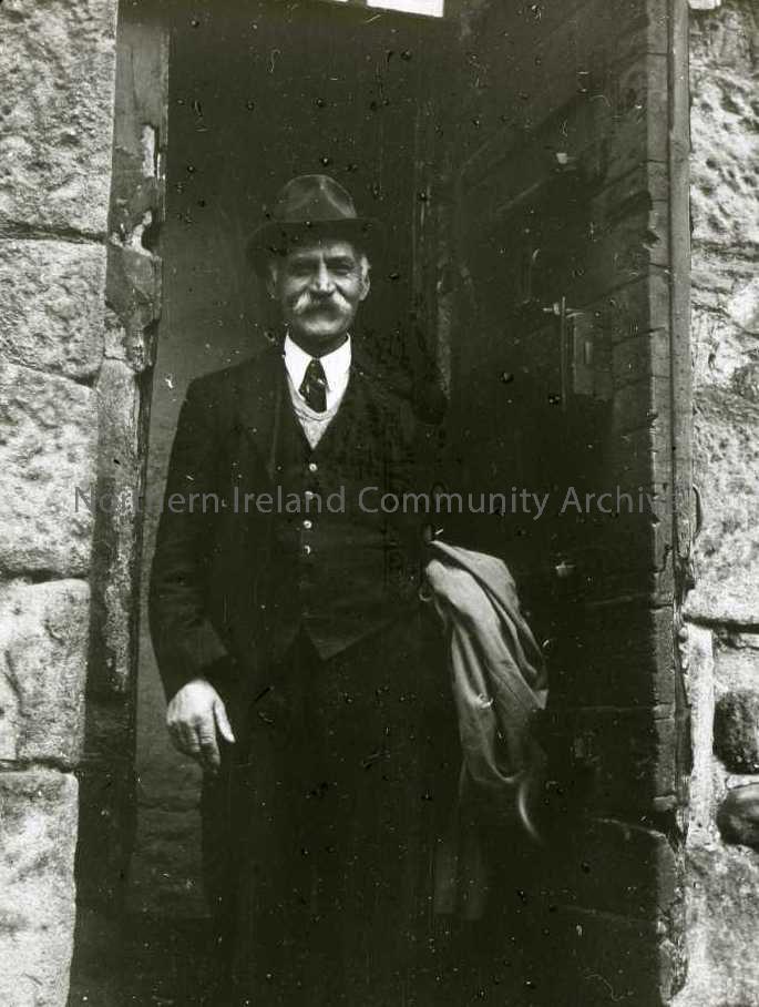 Man (John McCambridge) in suit and hat, standing in doorway. Notation on slide - died 2.11.42. (JM - at Turnley's Tower [Curfew tower], Cushendall)