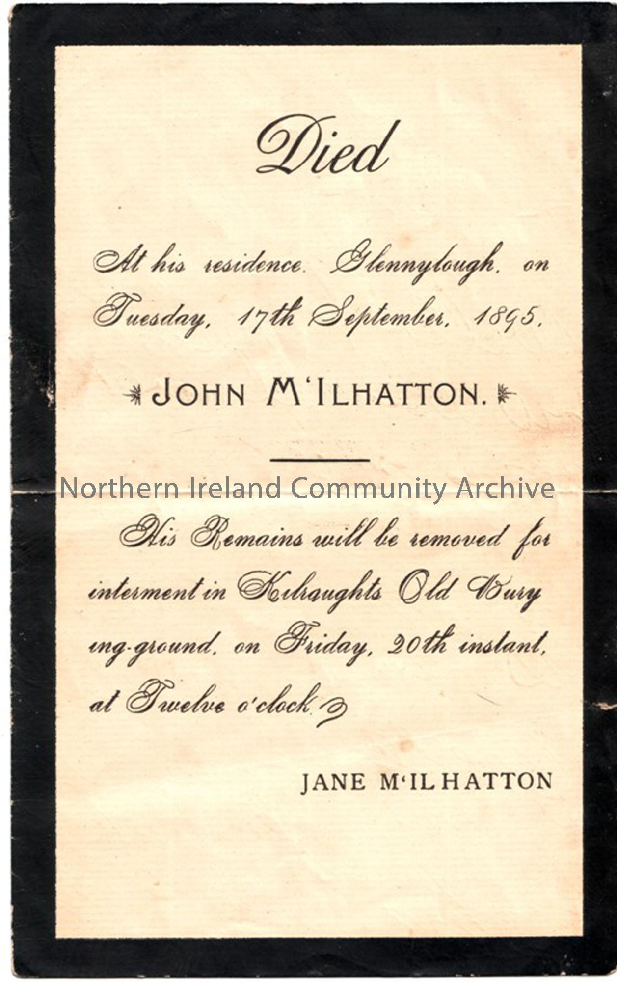 John McIlhatton of Glennylough, buried in Kilraughts Old Burying Ground d. 17th September 1895