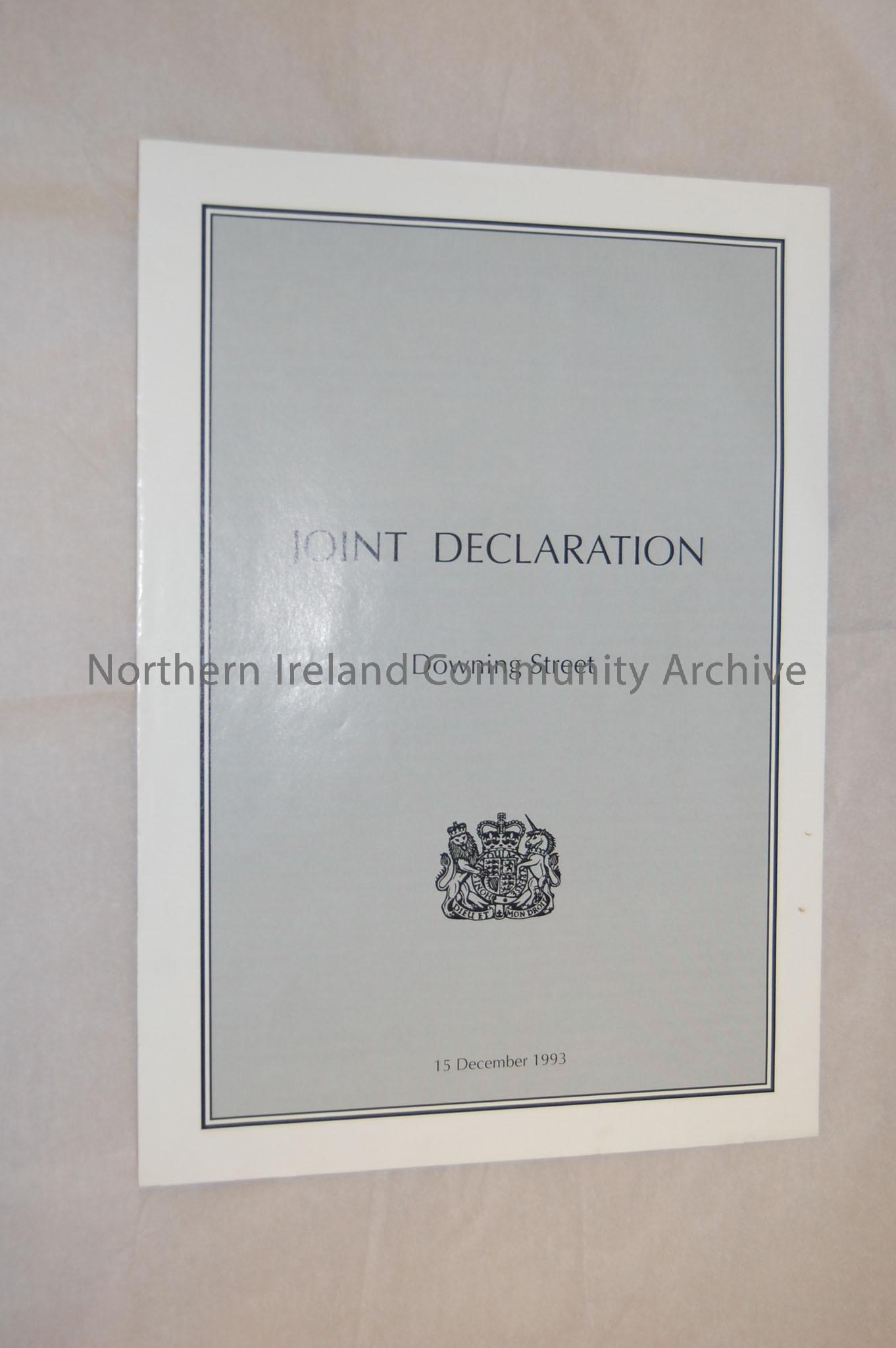 Joint Declaration by John Major, U.K. Prime minister and Albert Reynolds, Taoiseach regarding the constitutional future of Northern Ireland. Outlines terms by both the U.K and Republic of Ireland