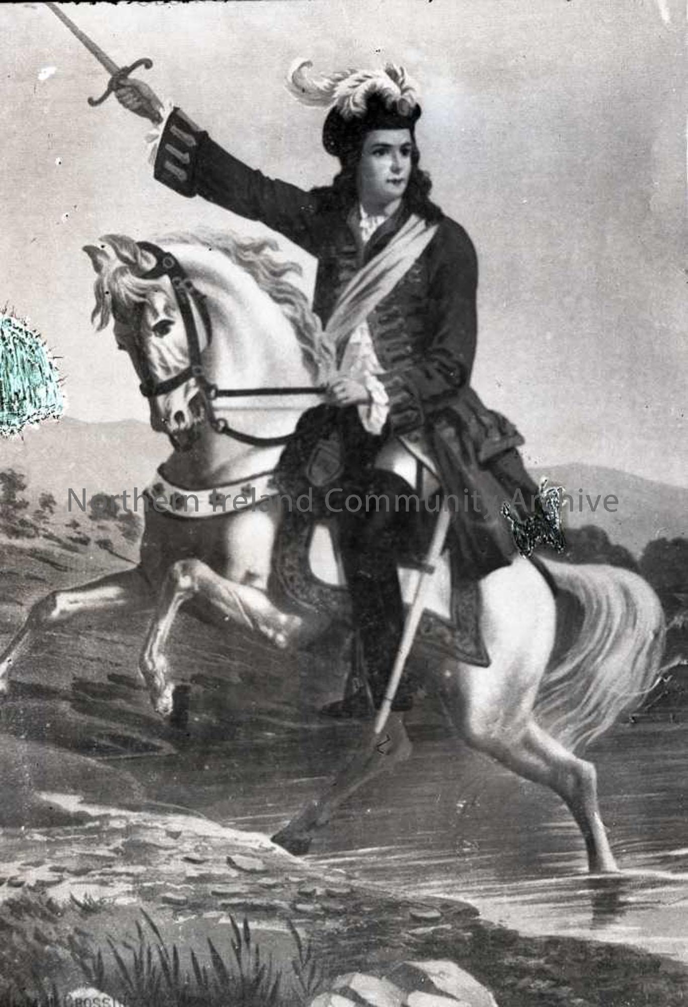 Black and white plate of King William III on horseback. No 189 on Nature Slides inventory