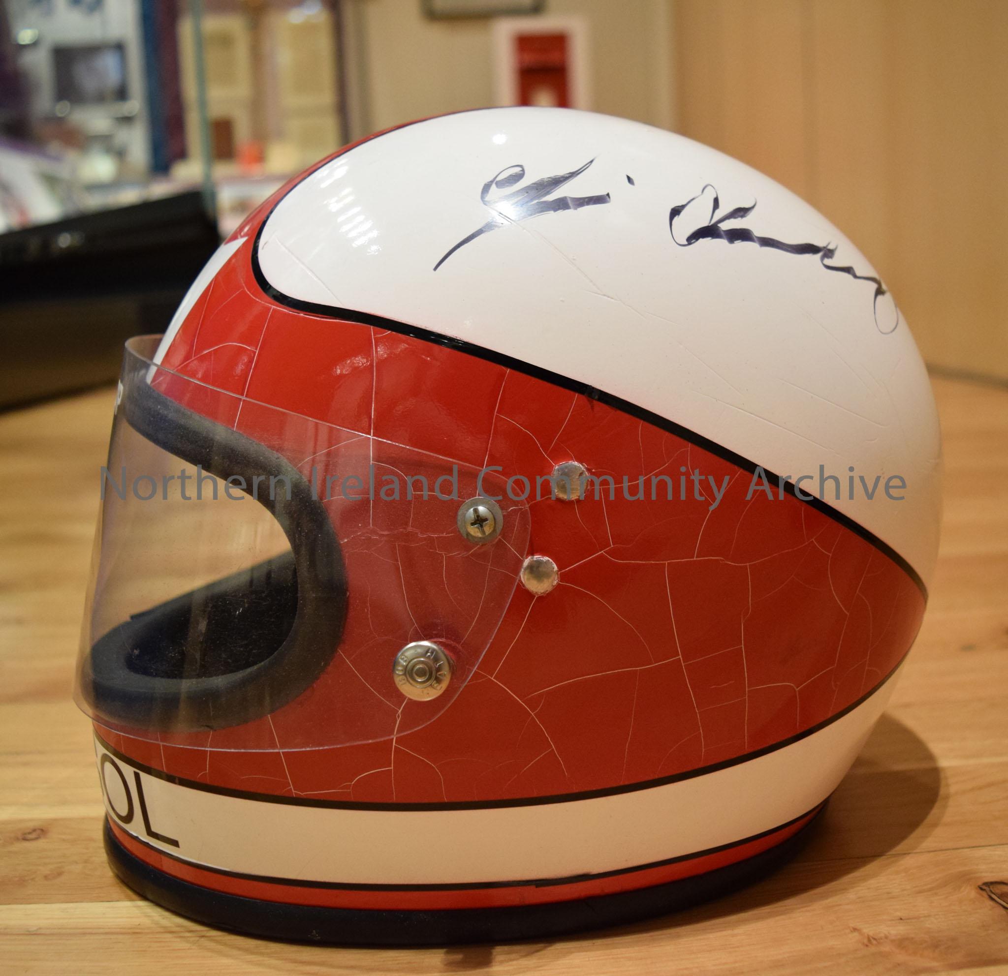 Kangol motorcycle helmet belonging to Jim Dunlop. White helmet with a red pattern with white crown shape at the front above the visor. – 2016.108 (3)