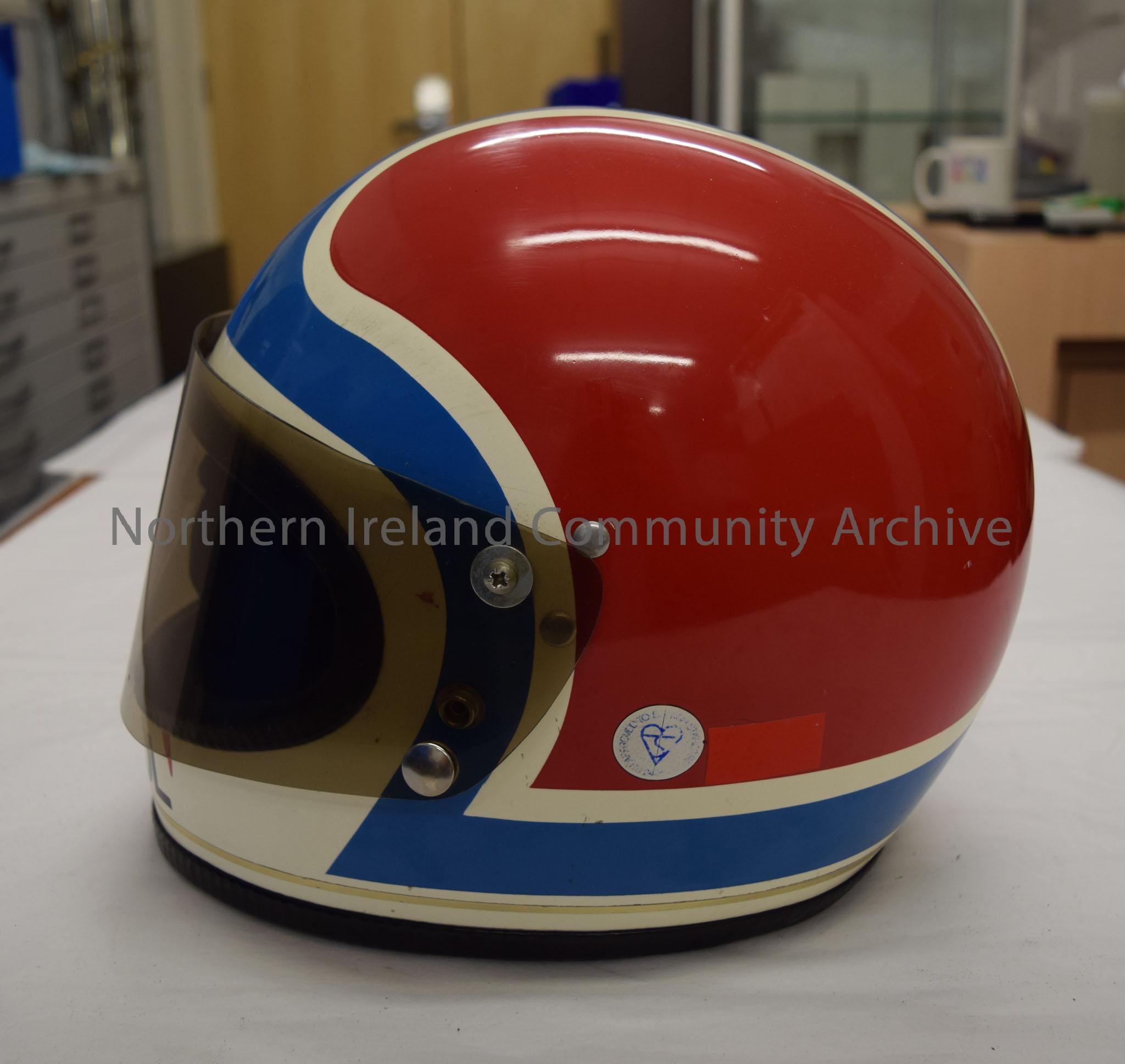 Kangol motorcycle helmet belonging to Jim Scott. Blue helmet with red pattern and white trim with a white chin bar.