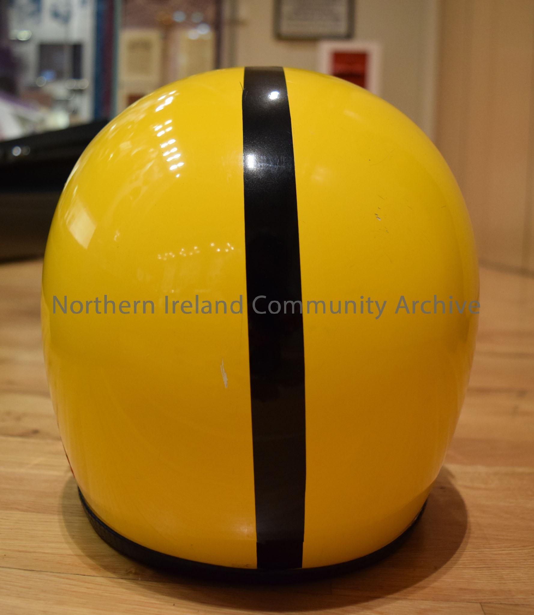 Kangol motorcycle helmet belonging to Joey Dunlop. Matt yellow helmet with a black strip down the middle. – 2016.106 (4)