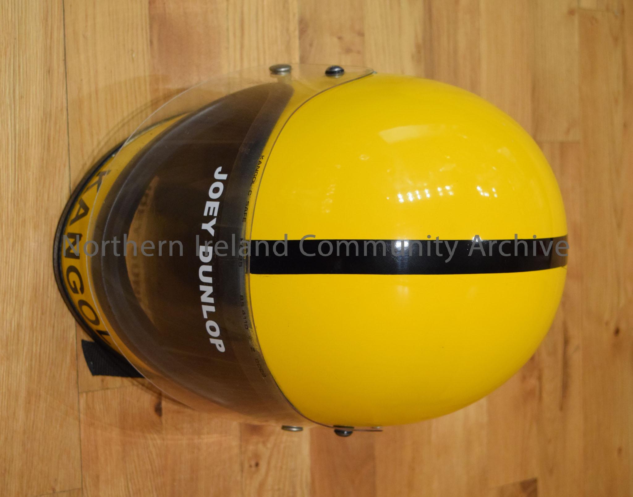 Kangol motorcycle helmet belonging to Joey Dunlop. Matt yellow helmet with a black strip down the middle.