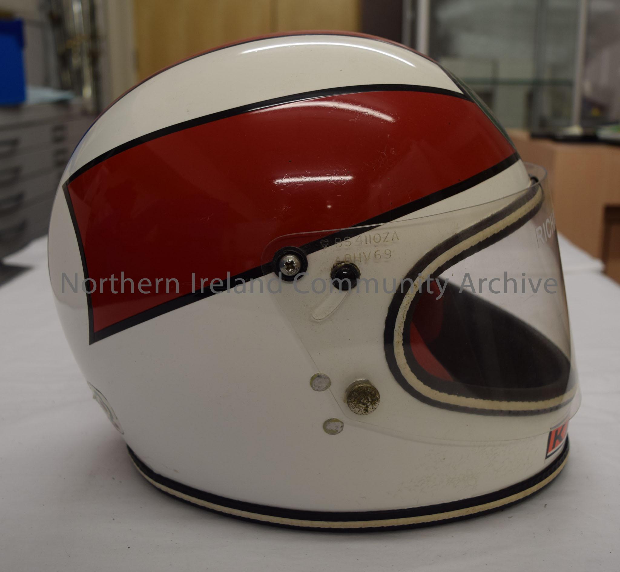 Kangol motorcycle helmet belonging to Richard Creith. White helmet with three pronged red pattern on top and Mid Antrim Motor Club logo of a winged ty… – 2016.86 (5)