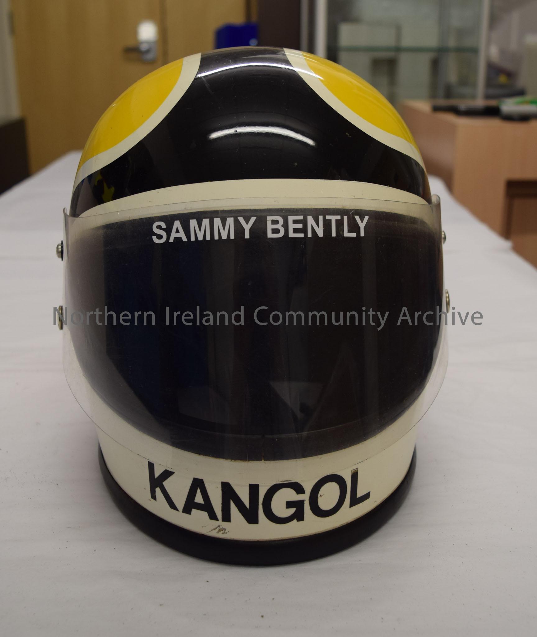 Kangol motorcycle helmet belonging to Sammy Bentley. Yellow helmet with black pattern and white border.