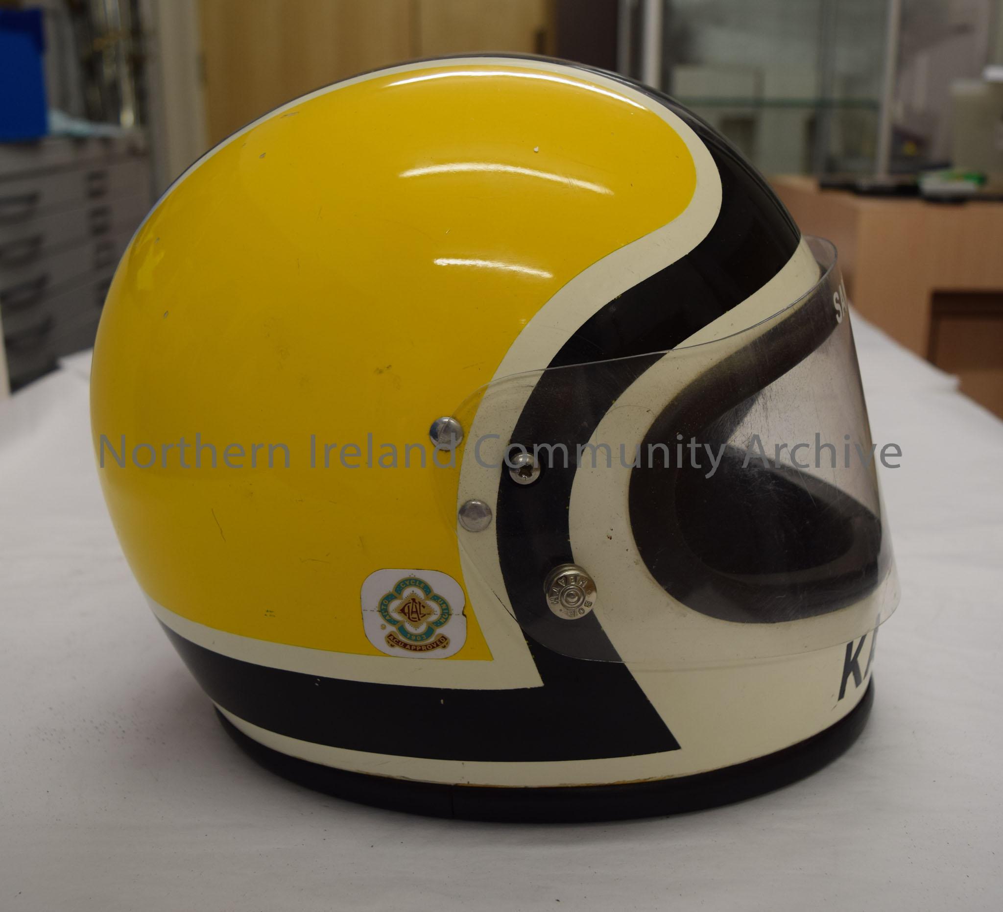 Kangol motorcycle helmet belonging to Sammy Bentley. Yellow helmet with black pattern and white border. – 2016.62 (5)