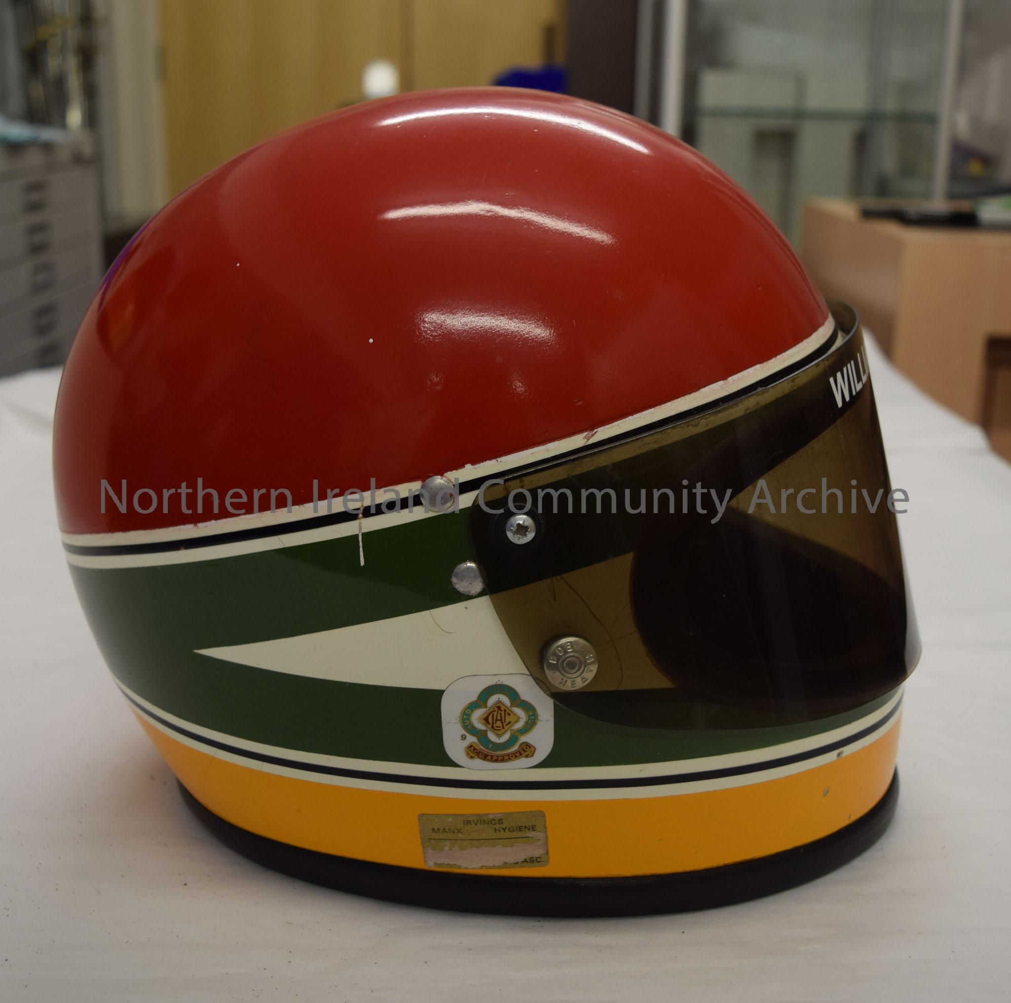 Kangol motorcycle helmet belonging to William McKillop. Helmet with red top, green and white stripe round the middle and a yellow bottom.