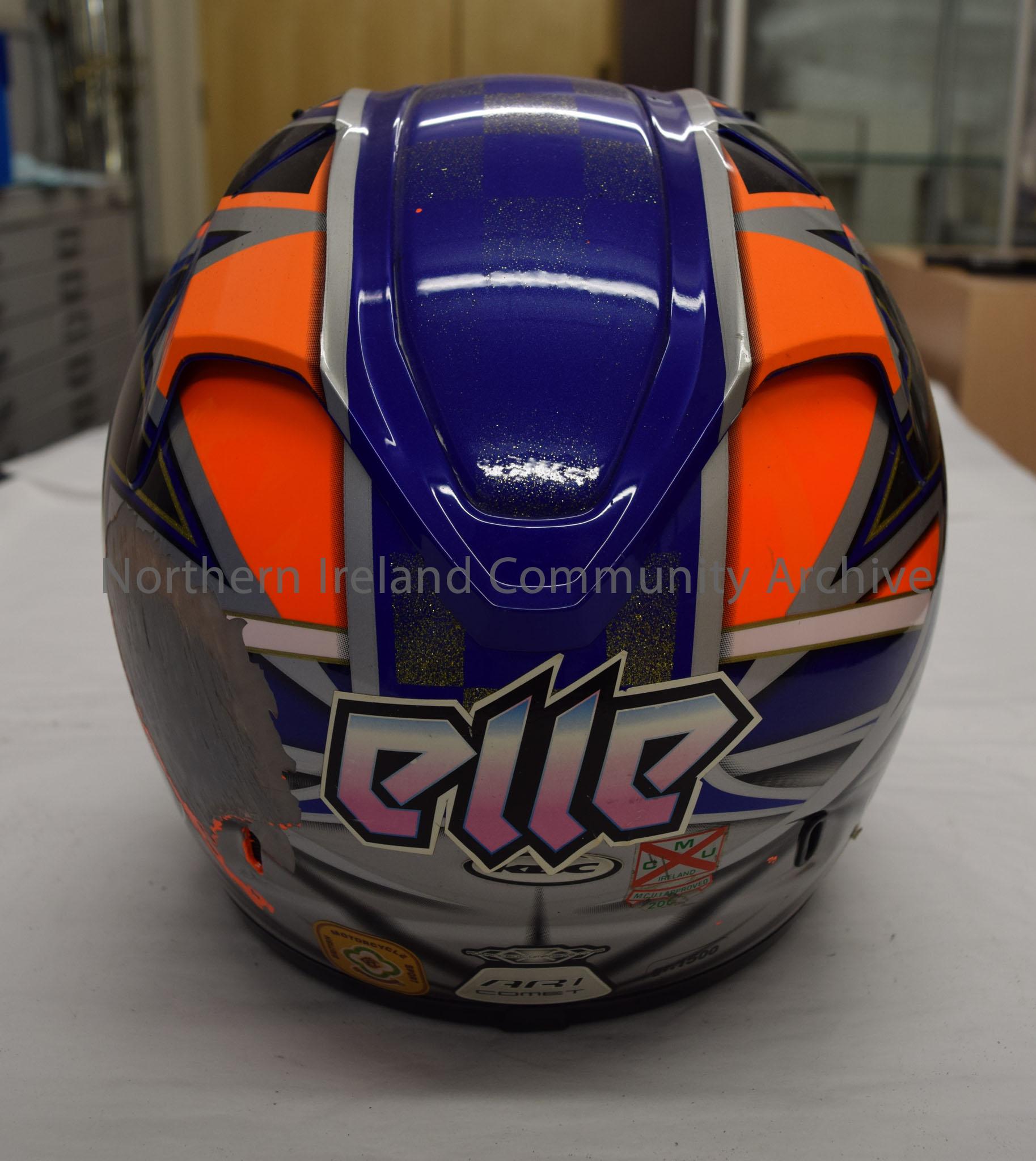 KBC motorcycle helmet belonging to Elle Forest. Black helmet with orange silver and blue pattern and black stars on the side. Blue and sparkling gold … – 2016.43 (4)