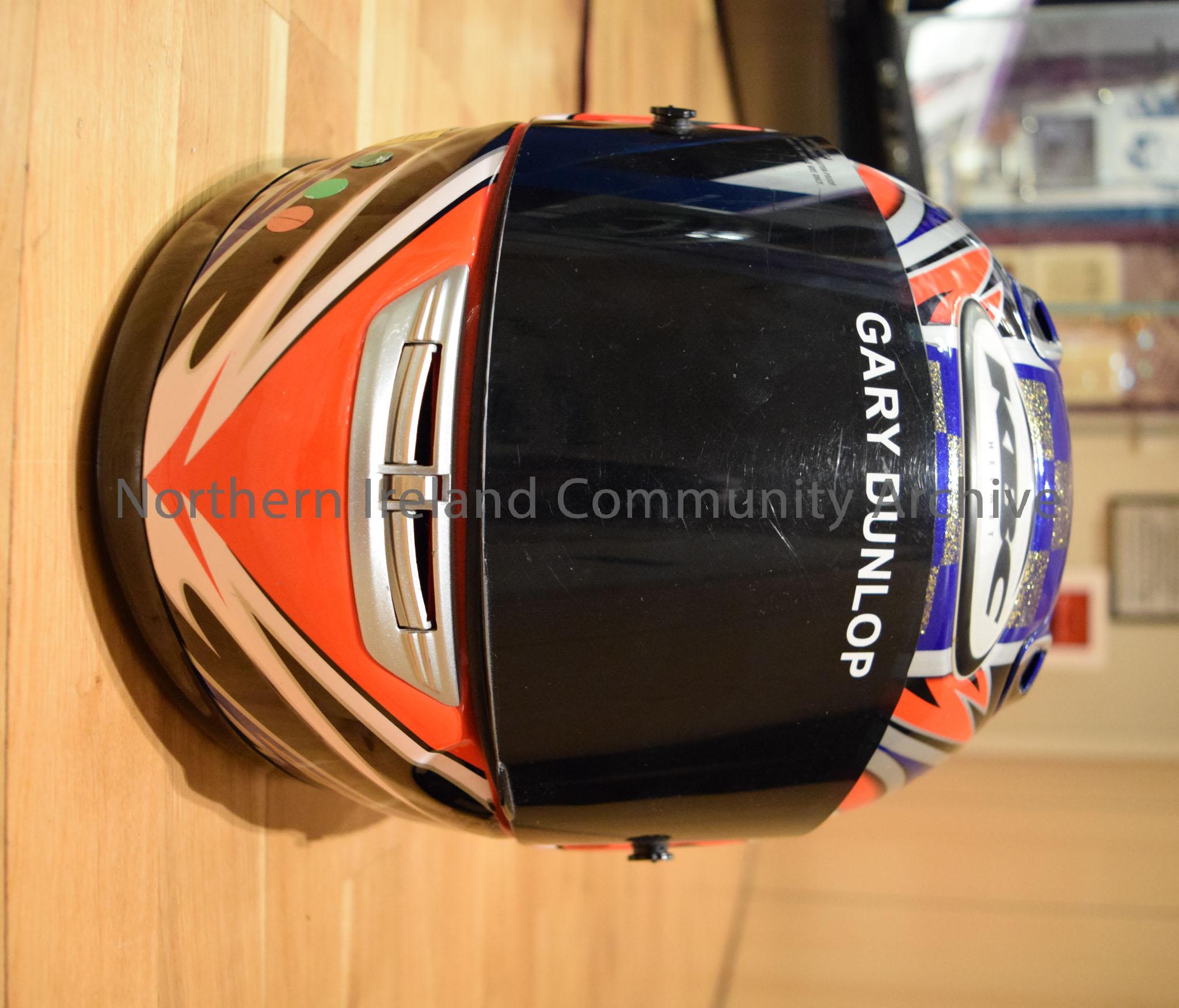 KBC motorcycle helmet belonging to Gary Dunlop. Helmet with blue and sparkling gold chequered pattern down the middle with black/grey star on either side and an orange, grey and black pattern.