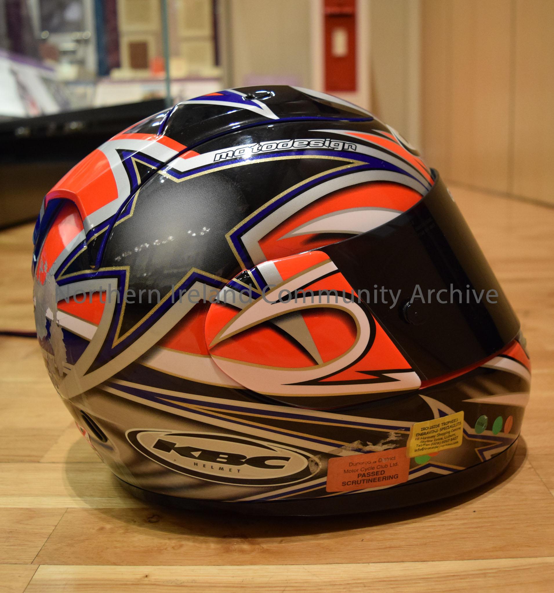 KBC motorcycle helmet belonging to Gary Dunlop. Helmet with blue and sparkling gold chequered pattern down the middle with black/grey star on either side and an orange, grey and black pattern.