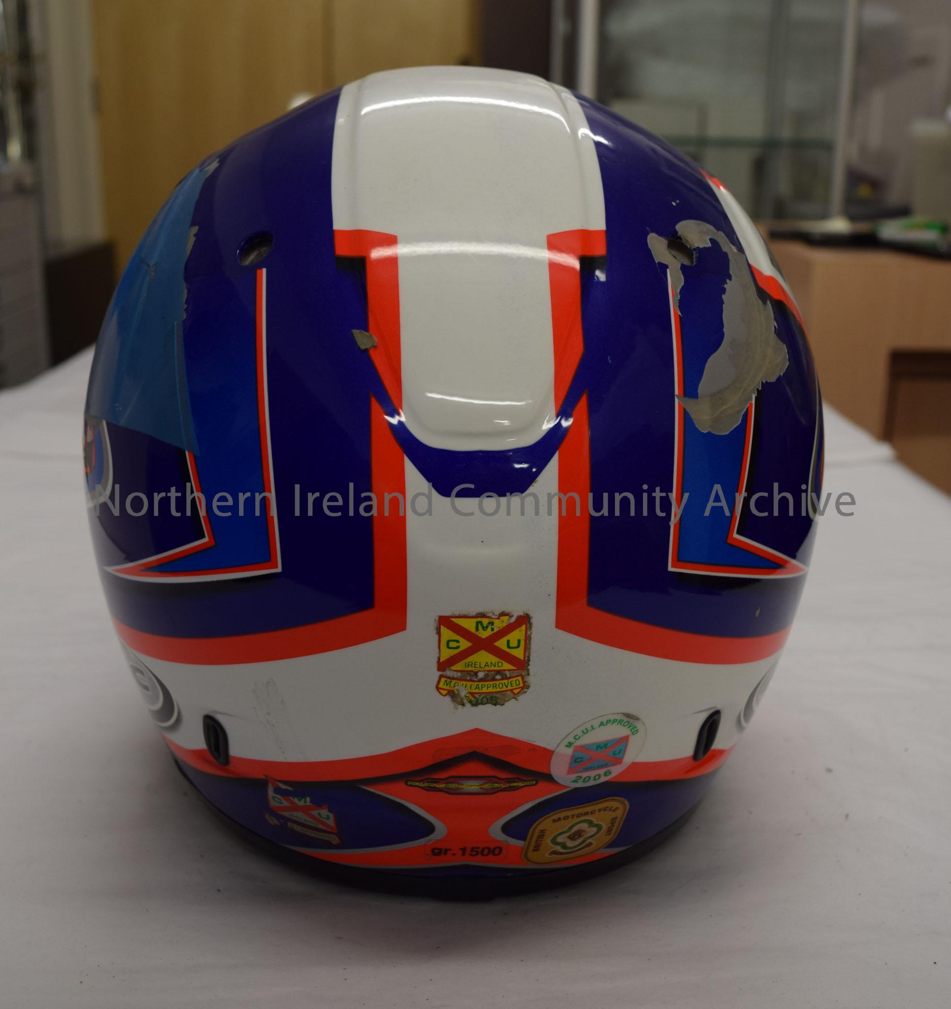 KBC motorcycle helmet belonging to James Christie. Dark blue helmet with white stripe down the middle and a blue, bright orange, white and silver pattern across it.