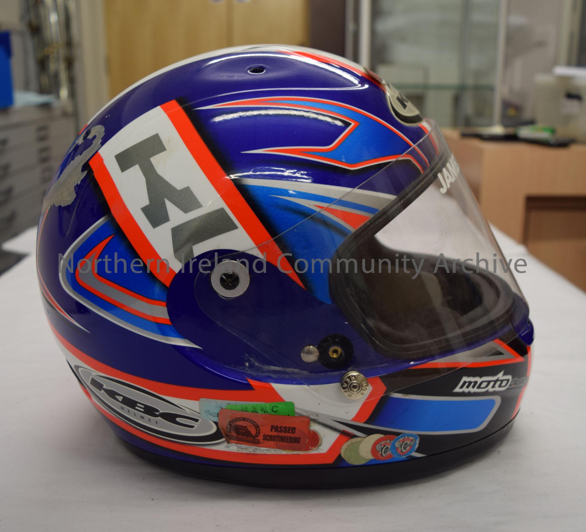 KBC motorcycle helmet belonging to James Christie. Dark blue helmet with white stripe down the middle and a blue, bright orange, white and silver pattern across it.