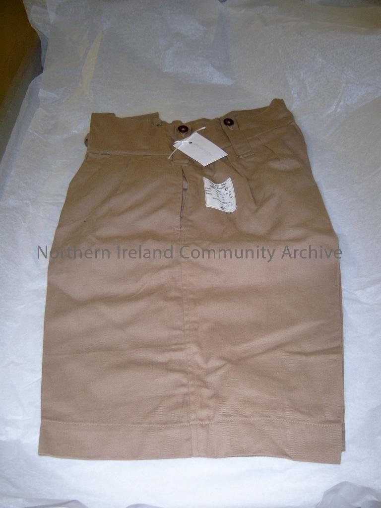 khaki Drill shorts (1941 pattern) size no. 6. Marked on label Height 5 ft 5 ins to 5 ft 6 ins, Waist 33 to 34 "