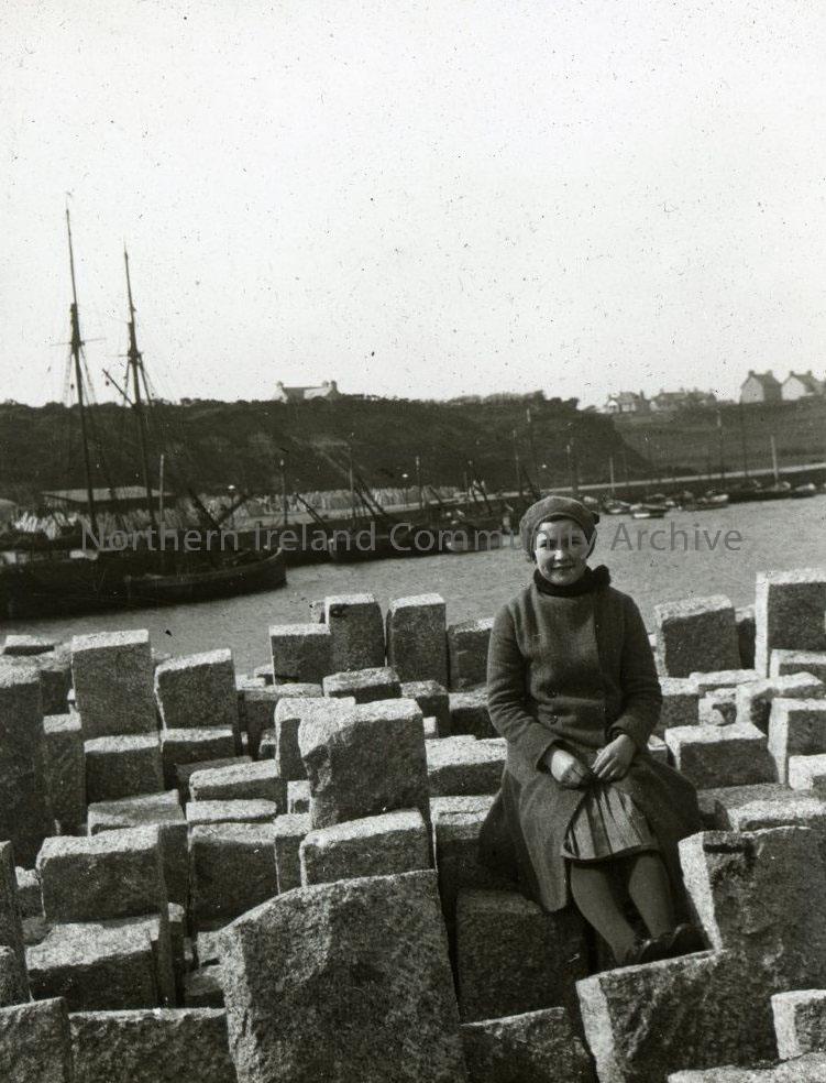Girl sitting on cut stone columns in harbour area - Kilkeel