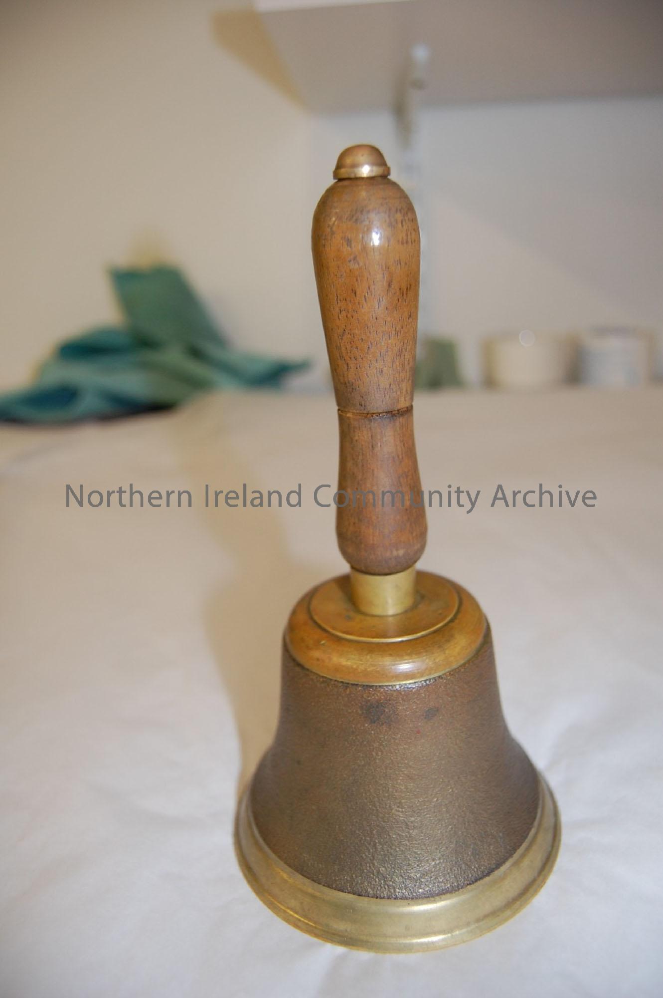 Killyrammer Primary School Bell. Hand bell, brass with wooden handle