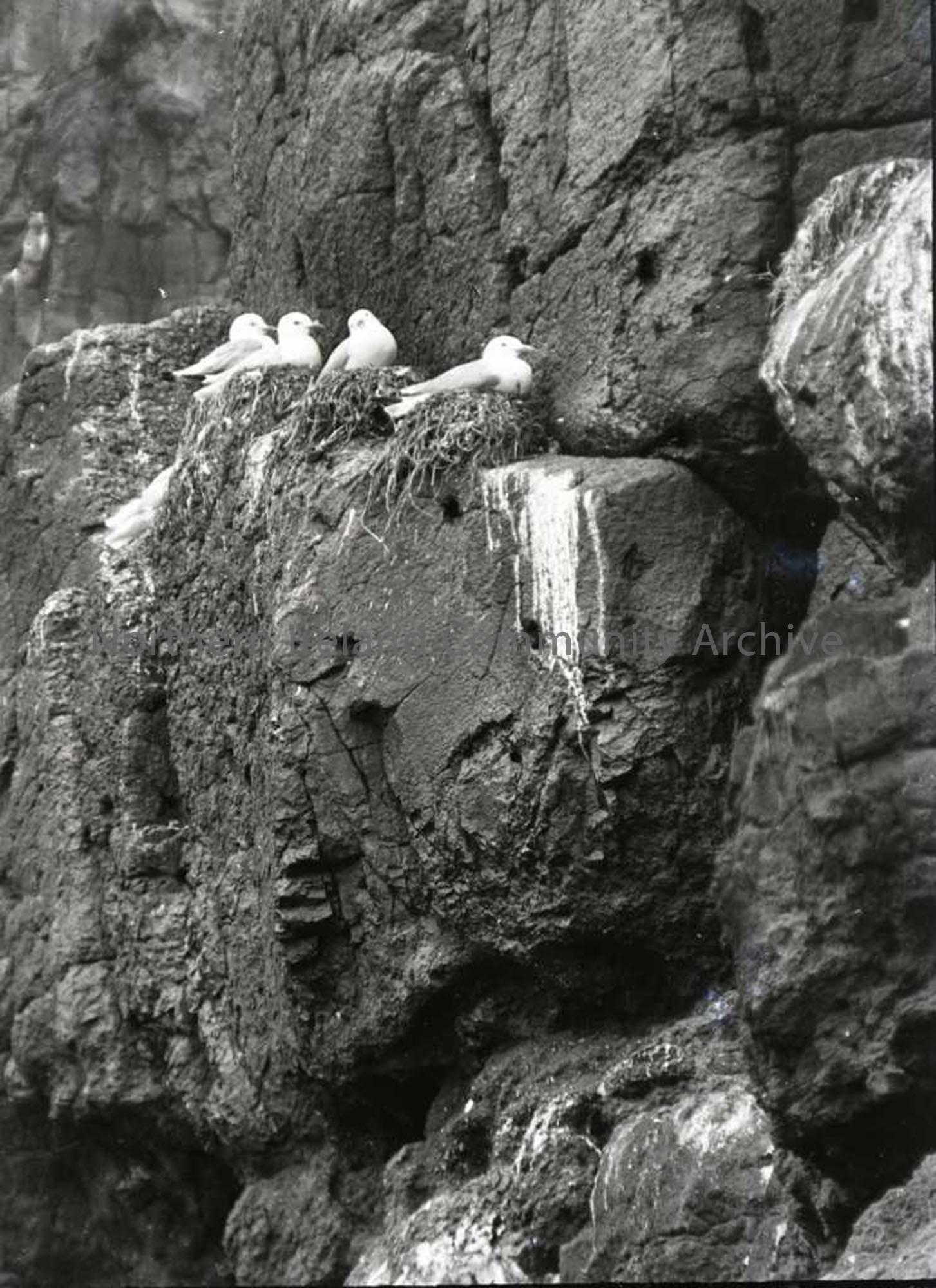 Entitled Kittiwakes - several birds in nests on rocky cliff face ledge. No 135 in Nature Slides inventory