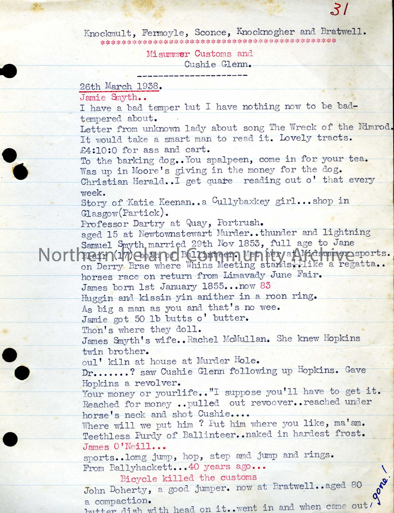 Knockmult, Fermoyle, Sconce, Knocknogher,and Bratwell - Midsummer Customs and Cushie Glenn. Names mentioned include Smyth, Blair, McMullan, Purdy, Doherty, Mullan, Glenn and Hopkins.