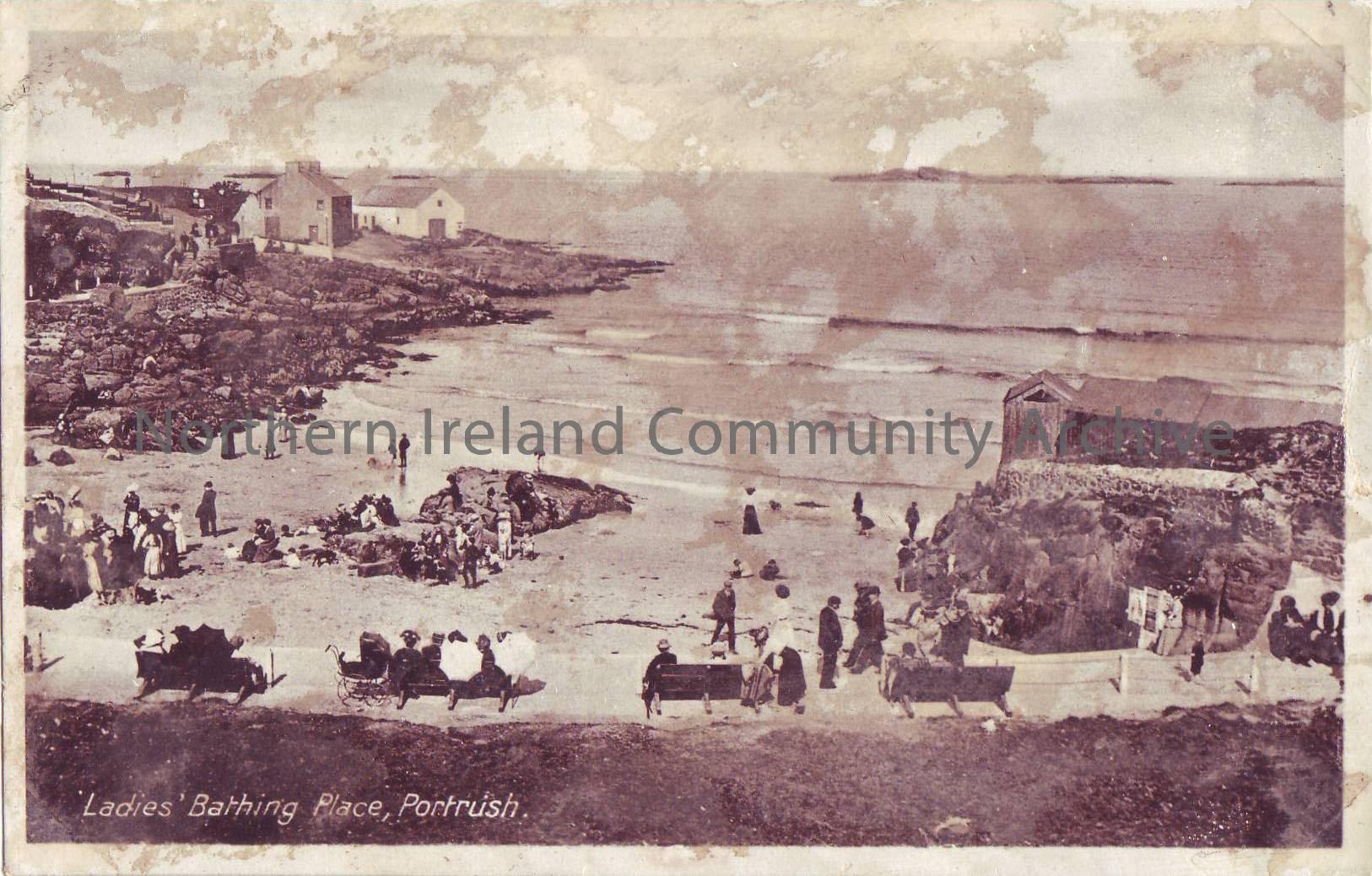 postcard depicting Ladies Bathing Place, Portrush. Victorian dressed males and females sitting on beach with buildings to left and right.