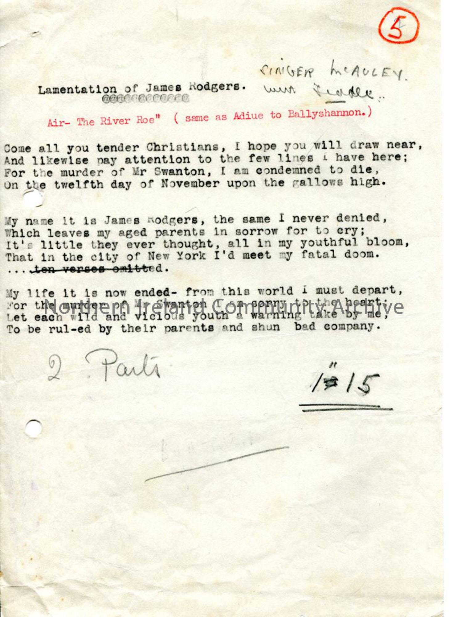 Typed words to 'Lamentation of James Rodgers' - hanged for murder of Mr Swanton.