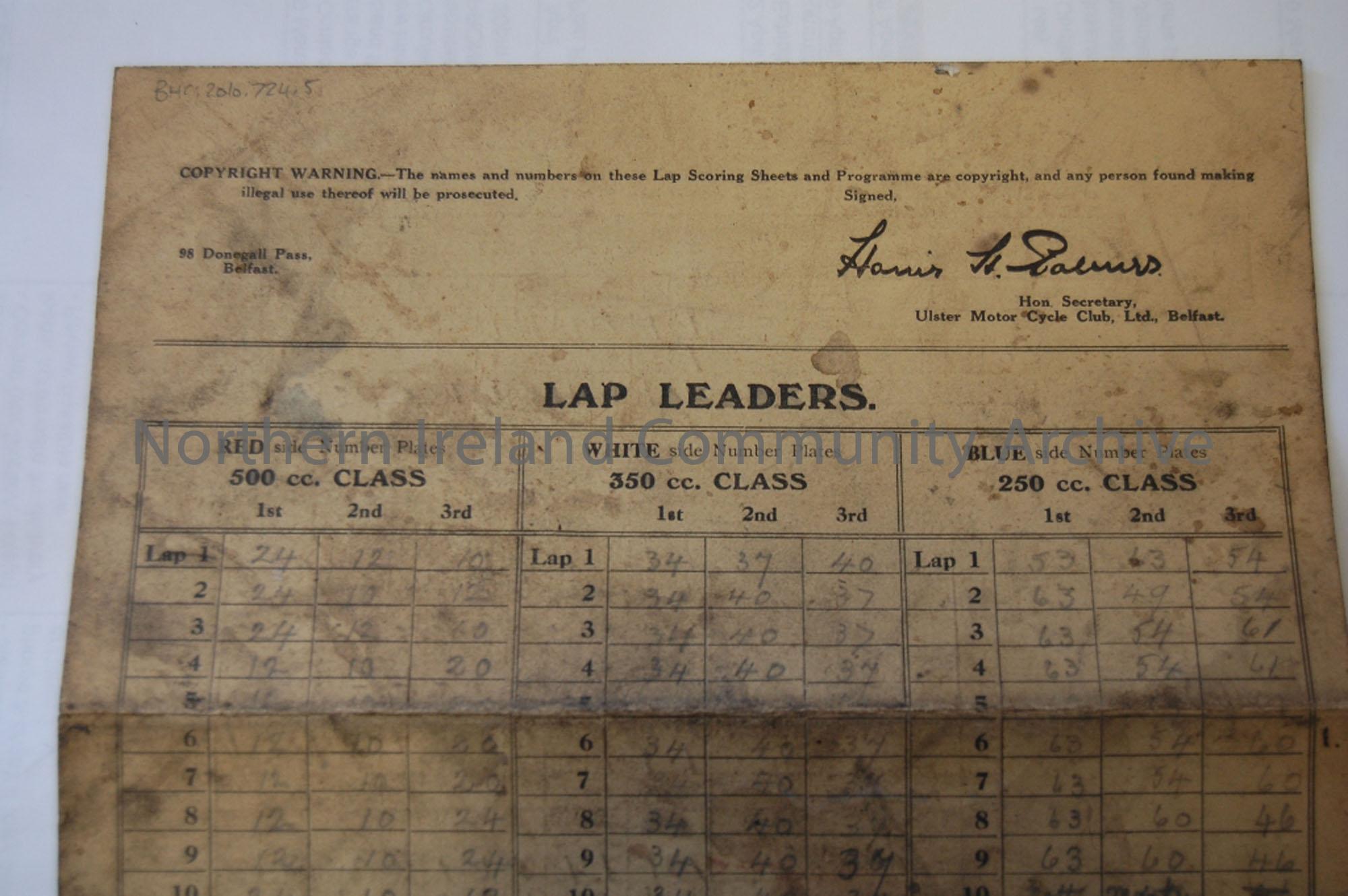 Lap scoring sheet for Classic International Grand Prix, 1934 - double sided fold out card