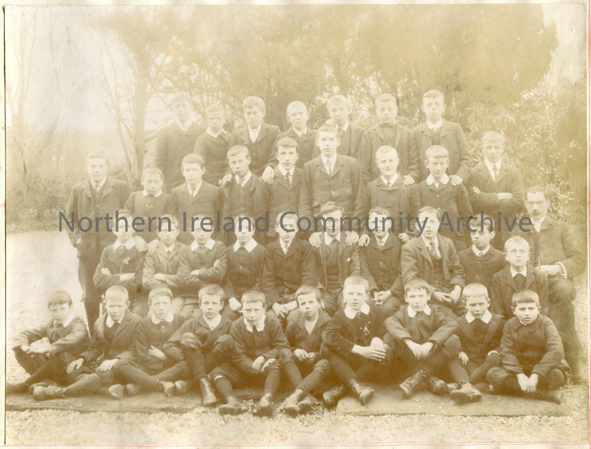 Large black and white photograph of pupils from the Model School, Senior Division, 1905. Included in the image in Sam Henry’s brother, Robert Henry, P…