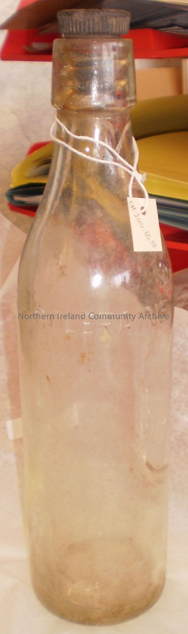 Large, clear glass bottle with ‘Hamilton Todd & Co. Coleraine’ imprinted on it. Black stopper on top reads ‘Braid, M.W.Co, Ballymena’.