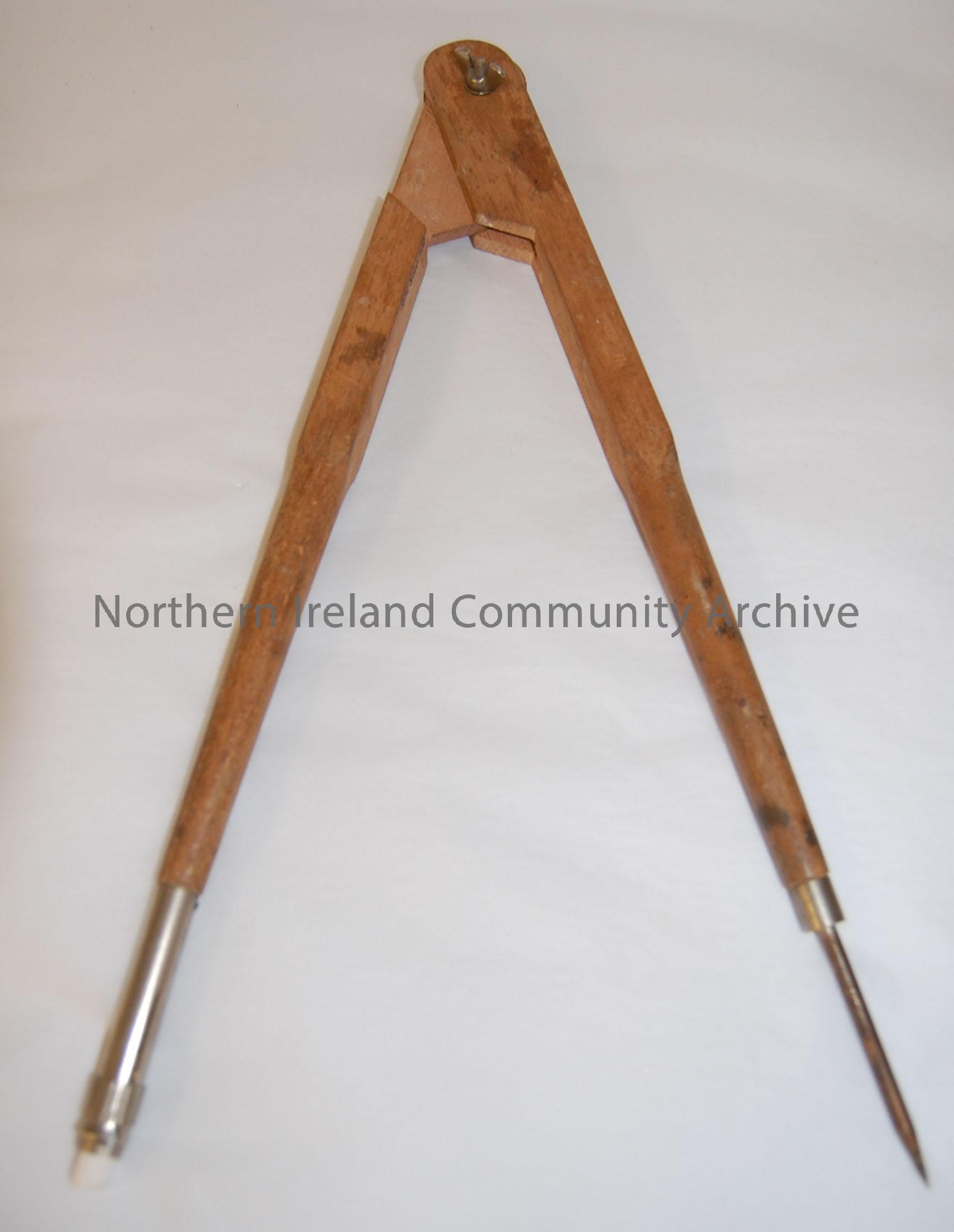 Large compass, used for drawing circles on school blackboard with chalk. ‘Helix/Made in England’ carved into wood.