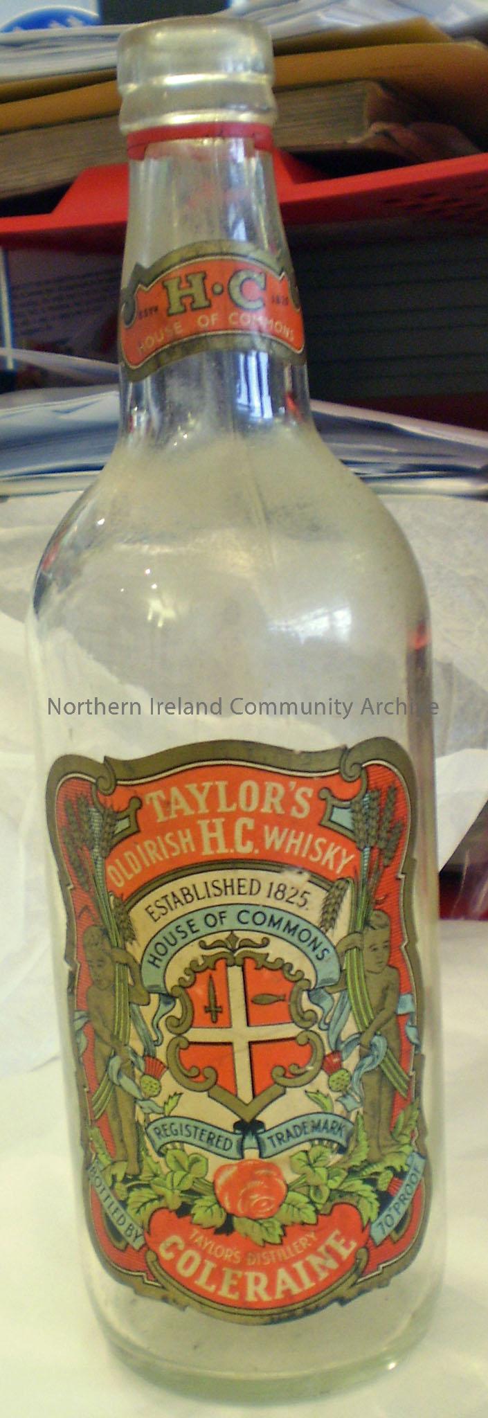 Large, curved, glass Taylor's Coleraine whisky bottle with decorative label. Label reads 'Taylor's Old Irish H.C Whisky, Established 1825, House of Commons, Registered trade mark, Bottled by Taylor's Distillery, Coleraine 70 proof'. Small red and gold label on the neck reads 'H.C Estd 1825, House of Commons'.